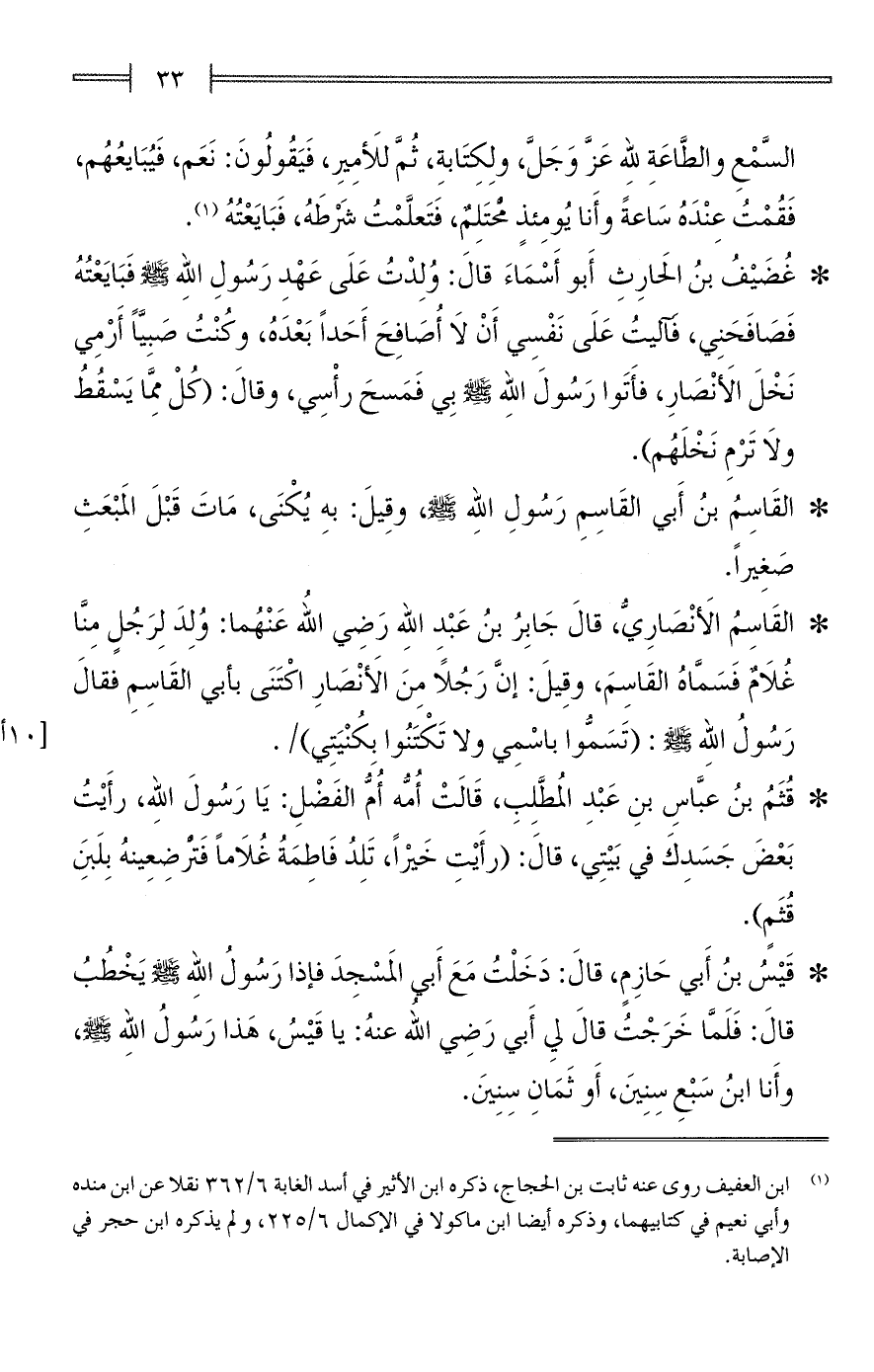 * غُضَيْفُ بنُ الحَارِثِ أَبو أَسْمَاءَ قالَ: وُلِدْتُ عَلَى عَهْدِ رَسُولِ الله - صلى الله عليه وسلم - فَبَايَعْتُهُ فَصَافَحَنِي، فَآليتُ عَلَى نَفْسِي أَنْ لَا أُصَافِحَ أَحَدًا بَعْدَهُ، وكُنْتُ صَبِيًّا أَرْمِي نَخْلَ الأَنْصَارِ، فأَتَوا رَسُولَ الله - صلي الله عليه وسلم بِي فَمَسحَ رأْسِي، وقالَ: (كُلْ مِمَّا يَسْقُطُ ولَا تَرْمِ نَخْلَهُم).