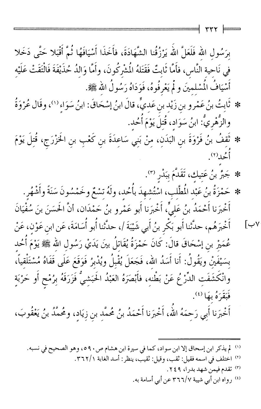 أَخْبَرنا أَحْمَدُ بنُ عَلِيٍّ، أَخْبَرنا أَبو عَمْرو بنُ حَمْدَان، أنَّ الحَسَنَ بنَ سُفْيَانَ أَخْبَرهُم، حدَّثنا أَبو بَكْرِ بنُ أَبي شَيْبَةَ، حدَّثنا أُبو أُسَامَةَ، عَن ابنِ عَوْنٍ، عَنْ عُمَيْرِ بنِ إسْحَاقَ قالَ: كَانَ حَمْزَةُ يُقَاتِلُ بينَ يَدَيْ رَسُولِ الله - صلى الله عليه وسلم - يَوْمَ أُحُدٍ بِسَيْفَينِ ويَقُولُ: أَنا أَسَدُ الله، فَجَعَلَ يُقْبِلُ ويُدْبِرُ فَوَقَعَ عَلَى قَفَاهُ مُسْتَلْقِيًا، وانْكَشَفَتِ الدِّرْعُ عَنْ بَطْنهِ، فأَبْصَرَهُ العَبْدُ الحَبَشِيُّ فَزَرَقَهُ بِرُمْحٍ أَو حَرْبَةٍ فَبَقَرَهُ بِهَا (¬4).