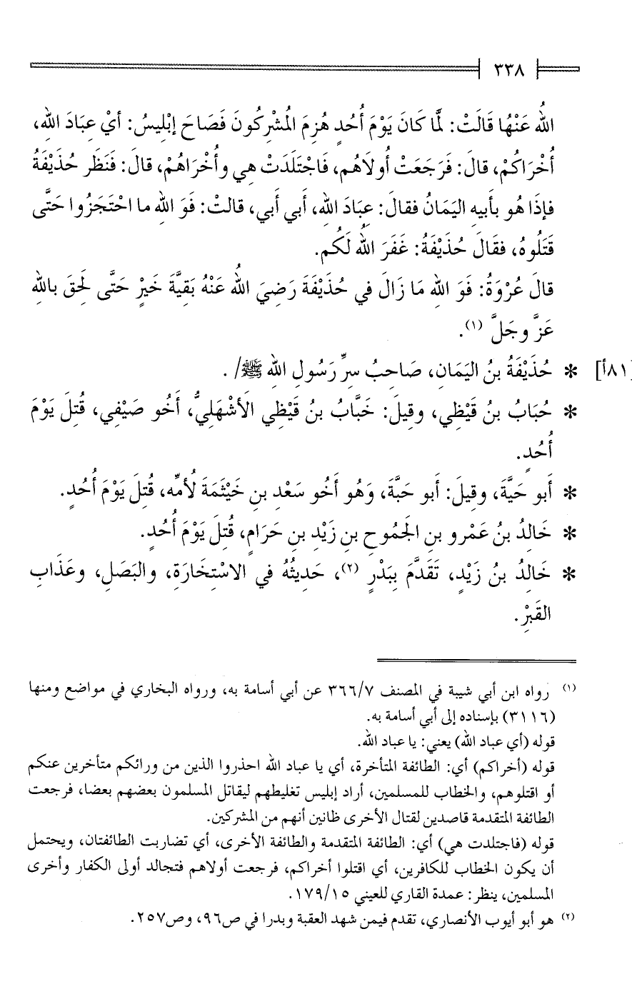 اللهُ عَنْهُا قَالَتْ: لمَّا كَانَ يَوْمَ أُحُدٍ هُزِمَ المُشْرِكُونَ فَصَاحَ إبْلِيسُ: أيْ عِبَادَ اللهِ، أُخْرَاكُمْ، قالَ: فَرَجَعَتْ أُولَاهُم، فَاجْتَلَدَتْ هِى وأُخْرَاهُمْ، قالَ: فَنَظَر حُذَيْفَةُ فإذَا هُو بأَبيهِ اليَمَانُ فقالَ: عِبَادَ اللهِ، أَبي أَبي، قالتْ: فَوَاللهِ ما احْتَجَزُوا حَتَّى قَتَلُوهُ، فقَالَ حُذَيْفَةُ: غَفَرَ الله لَكُم.