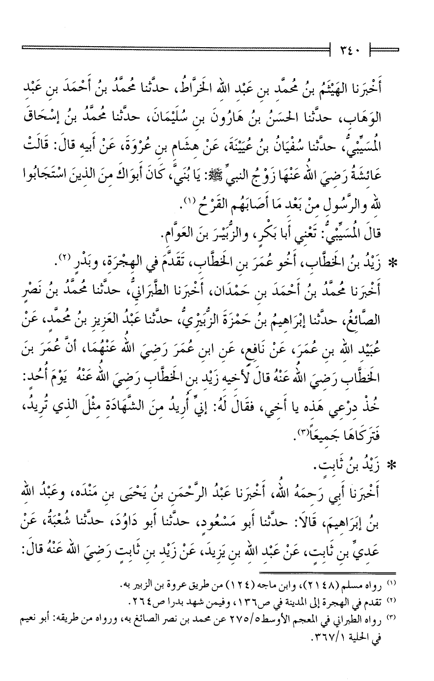 أَخْبَرنا مُحمَّدُ بنُ أَحْمَدَ بنِ حَمْدَان، أَخْبَرنا الطَّبَرانِيُّ، حدَّثنا مُحمَّدُ بنُ نَصْرٍ الصَّائِغُ، حدَّثنا إبْرَاهِيمُ بنُ حَمْزَةَ الزُّبَيْرِيُّ، حدَّثنا عَبْدُ العَزِيزِ بنُ مُحمَّدٍ، عَنْ عُبَيْدِ الله بنِ عُمَرَ، عَنْ نَافِعٍ، عَنِ ابنِ عُمَرَ رَضِىَ الله عَنْهُمَا، أنَّ عُمَرَ بنَ الخَطَّابِ رَضِىَ الله عَنْهُ قالَ لأخِيهِ زَيْدِ بن الخَطَّابِ رَضِىَ الله عَنْهُ يَوْمَ أُحُدٍ: خُذْ دِرْعِي هَذِه يا أَخِي، فقَالَ لَهُ: إنِّي أُرِيدُ مِنَ الشَّهَادَةِ مِثْلَ الذِي تُرِيدُ، فَتَركَاهَا جَمِيعًا (¬3).
