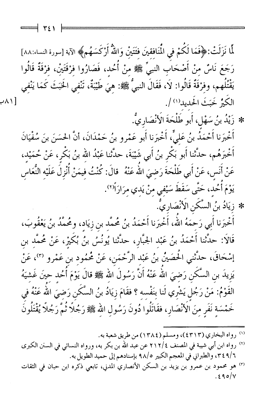 أَخْبَرنا أَبِي رَحِمَهُ الله، أَخْبَرنا أَحْمَدُ بنُ مُحمَّدِ بنِ زِيَادٍ، ومُحمَّدُ بنُ يَعْقُوبَ، قَالَا: حدَّثنا أَحْمَدُ بنُ عَبْدِ الجبَّارِ، حدَّثنا يُونُسُ بنُ بُكَيرٍ، عَنْ مُحمَّدِ بنِ إسْحَاقَ، حدَّثني الحُصَين بنُ عَبْد الرَّحْمَنِ، عَنْ مَحْمُودِ بنِ عَمْرو (¬3)، عَنْ زِيَادِ بنِ السَّكَنِ رَضِيَ الله عَنْهُ أَنَّ رَسُولَ الله - صلى الله عليه وسلم - قالَ يَوْمَ أُحُدٍ حِينَ غَشِيَهُ القَوْمُ: مَنْ رَجُلٍ يَشْرِي لَنا بِنَفْسِهِ؟ فقَامَ زِيَادُ بنُ السَّكَنِ رَضىَ الله عَنْهُ فيِ خَمْسَةٍ نَفَرٍ مِنَ الأَنْصَارِ، فقَاتَلُوا دُونَ رَسُولِ اللهِ - صلى الله عليه وسلم- رَجُلًا ثُمًّ رَجُلًا يُقْتَلُونَ
