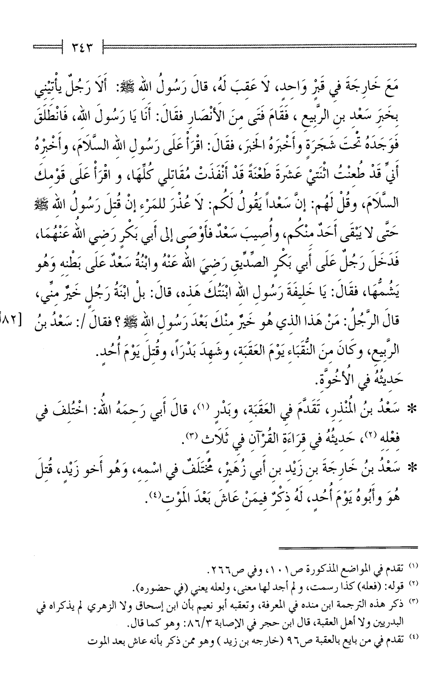 مَعَ خَارِجَةَ فيِ قَبْرٍ وَاحِدٍ، لَا عَقِبَ لَهُ، قالَ رَسُولُ الله - صلى الله عليه وسلم -: أَلَا رَجُلٌ يأْتِيْنِي بِخَبَرِ سَعْدِ بنِ الرَّبِيعِ، فَقَامَ فَتَى مِنَ الأَنْصَارِ فقَالَ: أَنَا يَا رَسُولَ الله، فَانْطَلَقَ فَوَجَدَهُ تحْتَ شَجَرَةٍ وأَخْبَرهُ الخَبَر، فقَالَ: اقْرَأْ عَلَى رَسُولِ الله السَّلَامَ، وأَخْبِرهُ أَنِّي قَدْ طُعِنْتُ اثْنَتيْ عَشَرةَ طَعْنَةً قَدْ أَنْفَذَتْ مُقَاتِلي كُلِّهَا، واقْرَأْ عَلَى قَوْمِكَ السَّلَامَ، وقُلْ لَهُم: إنَّ سَعْدًا يَقُولُ لَكُم: لَا عُذْرَ للمَرْءِ إنْ قُتِلَ رَسُولُ الله - صلى الله عليه وسلم - حَتَّى لا يَبْقَى أَحَدٌ مِنْكُم، وأُصِيبَ سَعْدٌ فأَوْصَى إلى أَبي بَكْرٍ رَضِى الله عَنْهُمَا، فَدَخَلَ رَجُلٌ عَلَى أَبي بَكْرٍ الصِّدِّيقِ رَضِيَ الله عَنْهُ وابْنُةُ سَعْدٌ عَلَى بَطْنِهِ وَهُو يَشُمُّهَا، فقَالَ: يَا خَلِيفَةَ رَسُولِ الله ابْنَتُكَ هَذِه، قالَ: بلْ ابْنَةُ رَجُلٍ خَير مِنِّي، قالَ الرَّجُلُ: مَنْ هَذا الذِي هُو خَير مِنْكَ بَعْدَ رَسُولِ اللهِ - صلى الله عليه وسلم -؟ فقالَ: سَعْدُ بنُ الرَّبِيعِ، وكَانَ مِنَ النُّقَبَاءِ يَوْمَ العَقَبَةِ، وشَهِدَ بَدْرًا، وقُتِلَ يَوْمَ أُحُدٍ.