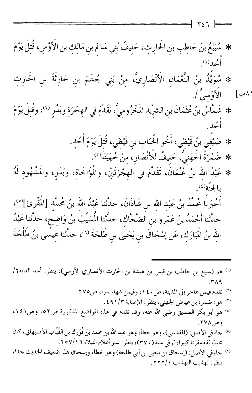 * عَبْدُ الله بنُ عُثْمَانَ، تَقَدَّمَ في الهِجْرَتَينِ، والمُؤَاخَاةِ، وبَدْرٍ، والمَشْهُودِ لَهُ بالجنَّةِ (¬4).