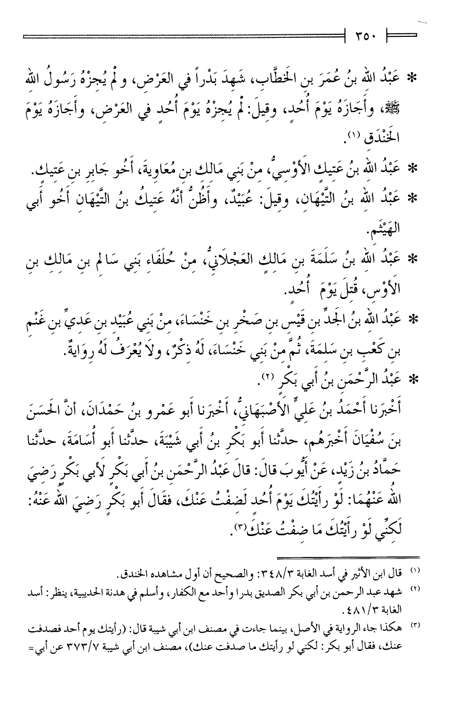 أَخْبَرنا أَحْمَدُ بنُ عَلِيٍّ الأَصبَهَانِيُّ، أَخْبَرنا أَبو عَمْرو بنُ حَمْدَانَ، أنَّ الحَسَنَ بنَ سُفْيَانَ أَخْبَرهُم، حدَّثنا أَبو بَكْرِ بنُ أَبي شَيْبَةَ، حدَّثنا أَبو أُسَامَةَ، حدَّثنا حَمَّادُ بنُ زَيْدٍ، عَنْ أَيُّوبَ قالَ: قالَ عَبْدُ الرَّحْمَنِ بنُ أَبي بَكْرٍ لأَبي بَكْرٍ رَضِيَ اللهُ عَنْهُمَا: لَوْ رأَيْتُكَ يَوْمَ أُحُدٍ لَضِفْتُ عَنْكَ، فقَالَ أَبو بَكْرٍ رَضِيَ الله عَنْهُ: لَكِنِّي لَوْ رأَيْتُكَ مَا ضِفْتُ عَنْكَ (¬3).