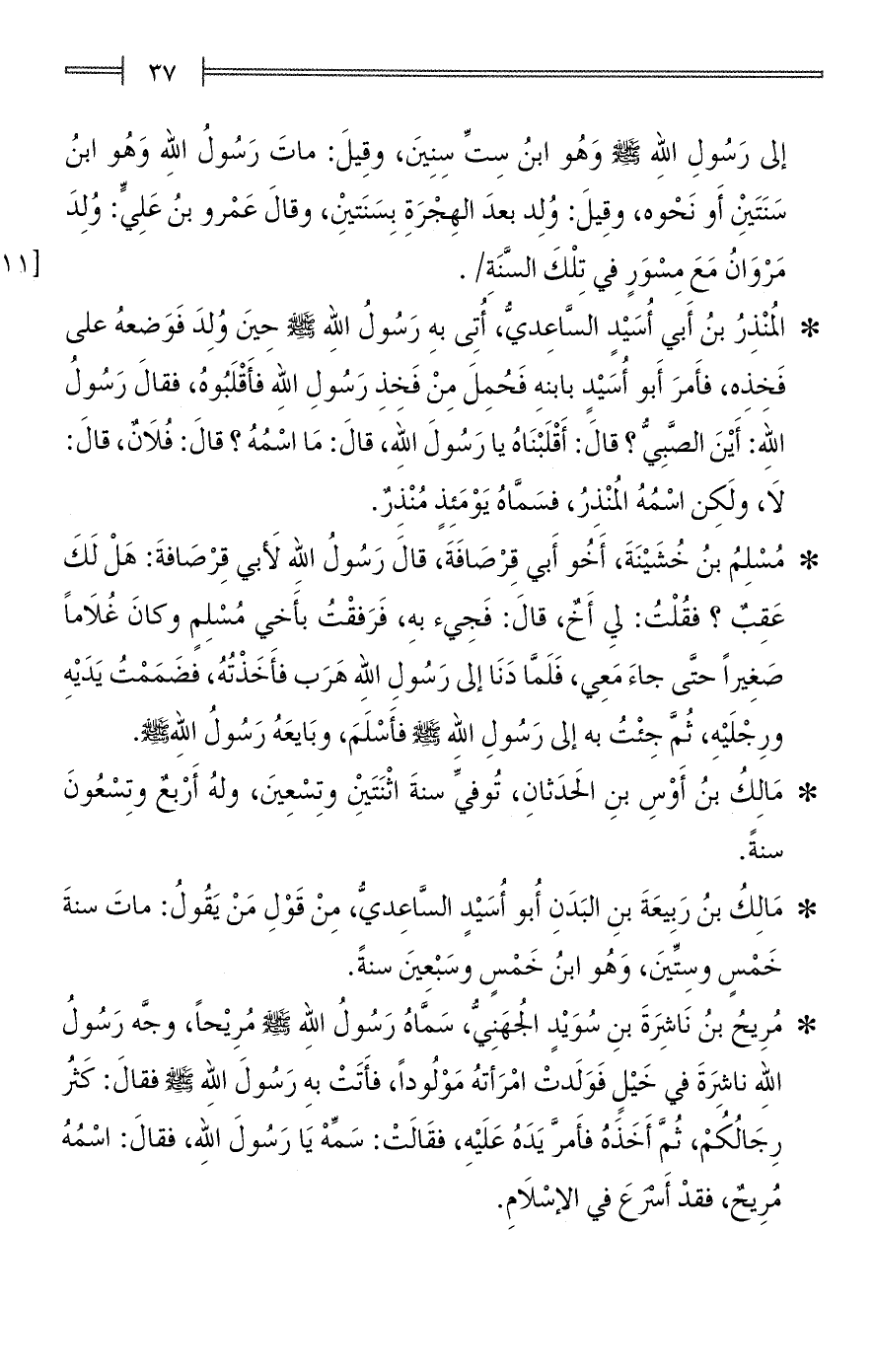 * المُنْذِرُ بنُ أَبي أُسَيْدٍ السَّاعِديُّ، أُتِى بهِ رَسُولُ اللهِ - صلى الله عليه وسلم - حِينَ وُلِدَ فَوَضعهُ على فَخِذِه، فأَمرَ أَبو أُسَيْدٍ بابنهِ فَحُمِلَ مِنْ فَخِذِ رَسُولِ الله فأَقْلَبُوهُ، فقالَ رَسُولُ الله: أَيْنَ الصَّبِيُّ؟ قالَ: أَقْلَبْنَاهُ يا رَسُولَ الله، قالَ: مَا اسْمُهُ؟ قالَ: فُلَانٌ، قالَ: لَا، ولَكِن اسْمُهُ المُنْذِرُ، فسَمَّاهُ يَوْمَئِذٍ مُنْذِرٌ.