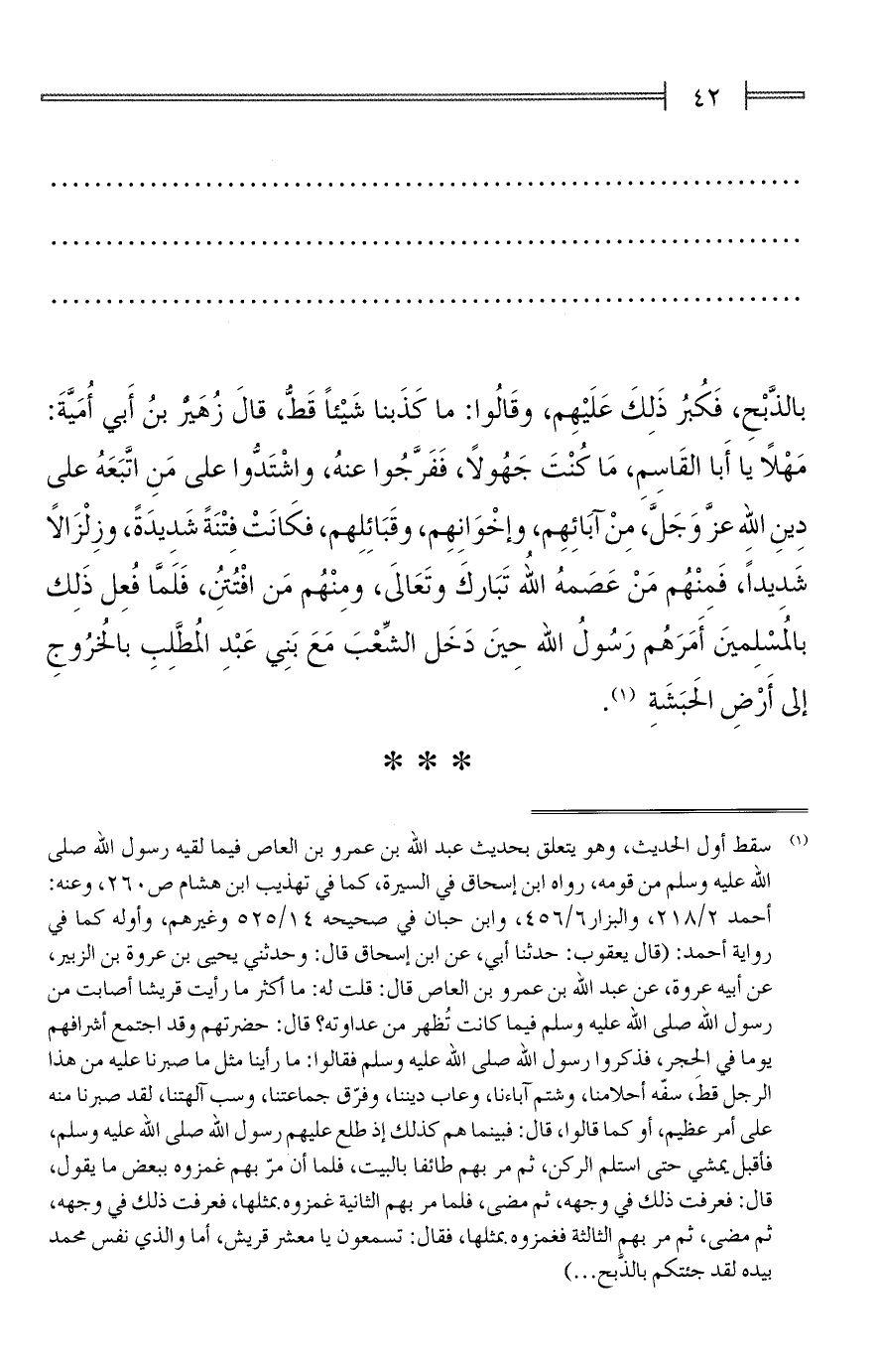 (¬1) سقط أول الحديث، وهو يتعلق بحديث عبد الله بن عمرو بن العاص فيما لقيه رسول الله صلى الله عليه وسلم من قومه، رواه ابن إسحاق في السيرة، كما في تهذيب ابن هشام ص 260، وعنه: أحمد 2/ 218، والبزار 6/ 456، وابن حبان في صحيحه 14/ 525 وغيرهم، وأوله كما في رواية أحمد: (قال يعقوب: حدثنا أبي، عن ابن إسحاق قال: وحدثني يحيى بن عروة بن الزبير، عن أبيه عروة، عن عبد الله بن عمرو بن العاص قال: قلت له: ما أكثر ما رأيت قريشا أصابت من رسول الله صلى الله عليه وسلم فيما كانت تُظهر من عداوته؟ قال: حضرتهم وقد اجتمع أشرافهم يوما في الحجر، فذكروا رسول الله صلى الله عليه وسلم فقالوا: ما رأينا مثل ما صبرنا عليه من هذا الرجل قط، سفّه أحلامنا، وشتم آباءنا، وعاب ديننا، وفرّق جماعتنا، وسب آلهتنا، لقد صبرنا منه على أمر عظيم، أو كما قالوا، قال: فبينما هم كذلك إذ طلع عليهم رسول الله صلى الله عليه وسلم، فأقبل يمشي حتى استلم الركن، ثم مر بهم طائفا بالبيت، فلما أن مرّ بهم غمزوه ببعض ما يقول، قال: فعرفت ذلك في وجهه، ثم مضى، فلما مر بهم الثانية غمزوه بمثلها، فعرفت ذلك في وجهه، ثم مضى، ثم مر بهم الثالثة فغمزوه بمثلها، فقال: تسمعون يا معشر قريش، أما والذي نفس محمَّد بيده لقد جئتكم بالذَّبح ...)
