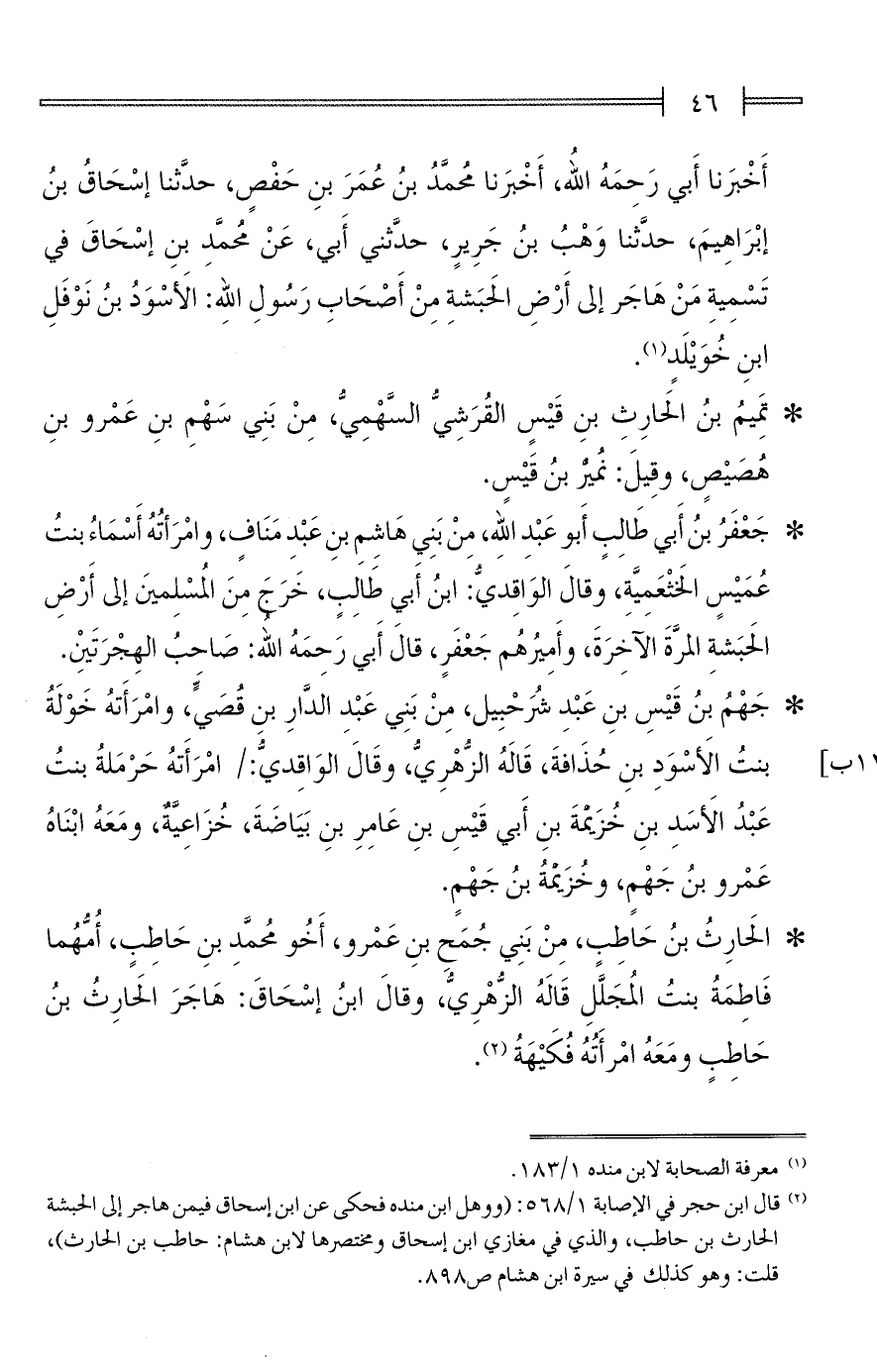(¬2) قال ابن حجر في الإصابة 1/ 568: (ووهل ابن منده فحكى عن ابن إسحاق فيمن هاجر إلى الحبشة الحارث بن حاطب، والذي في مغازي ابن إسحاق ومختصرها لابن هشام: حاطب بن الحارث)، قلت: وهو كذلك في سيرة ابن هشام ص 898.