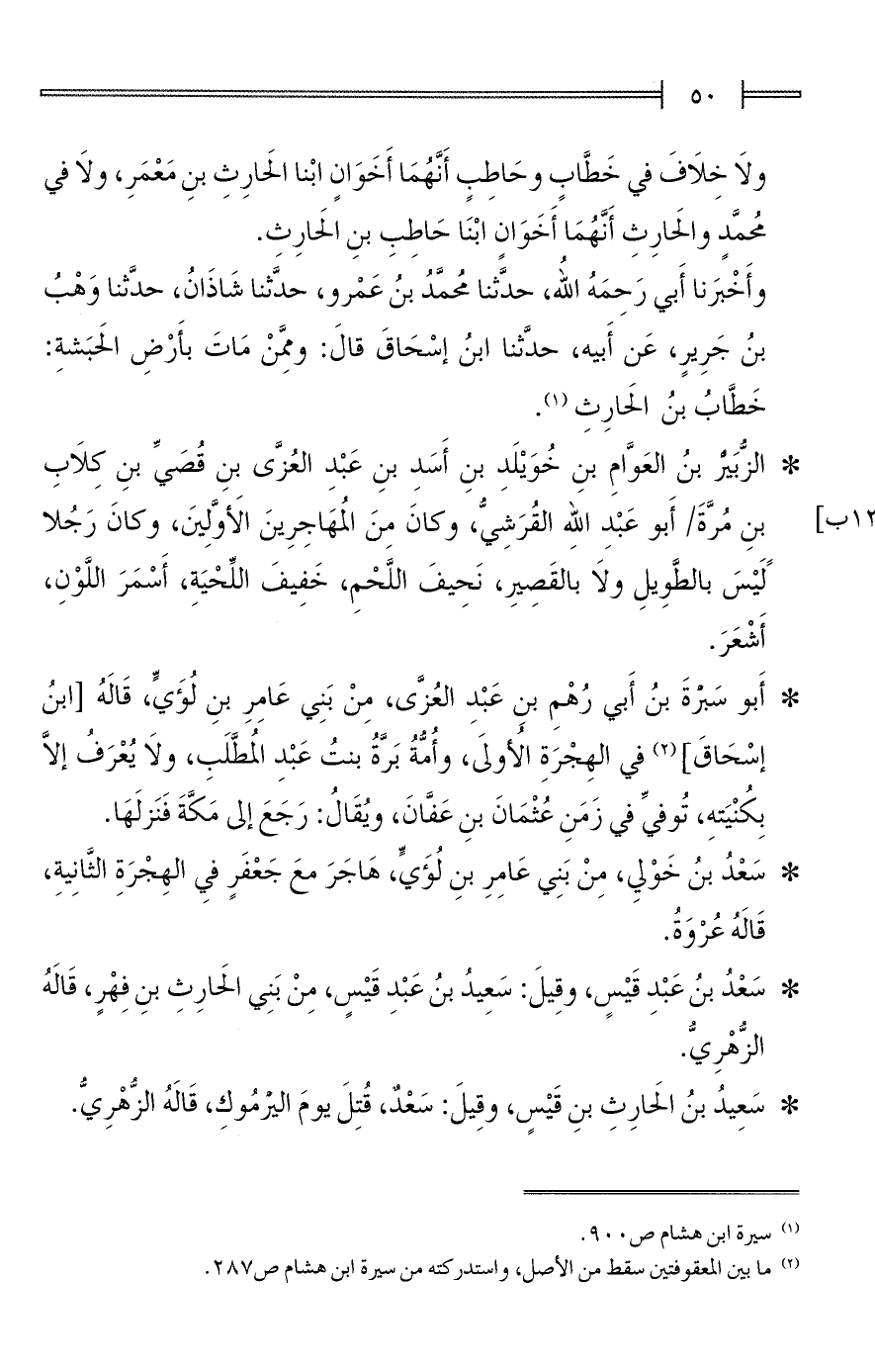 * أَبو سَبْرةَ بنُ أَبي رُهْمِ بنِ عَبْدِ العُزَّى، مِنْ بَنِي عَامِرِ بنِ لُؤَىٍّ، قَالَهُ [ابنُ إسْحَاقَ] (¬2) في الهِجْرَةِ الأُولىَ، وأُمُّهُ بَرَّةُ بنتُ عَبْدِ المُطَّلَبِ، ولَا يُعْرَفُ إلَّا بِكُنْيَتهِ، تُوفىِّ في زَمَنِ عُثْمَانَ بنِ عَفَّانَ، ويُقَالُ: رَجَعَ إلى مَكَّةَ فَنَزلَهَا.