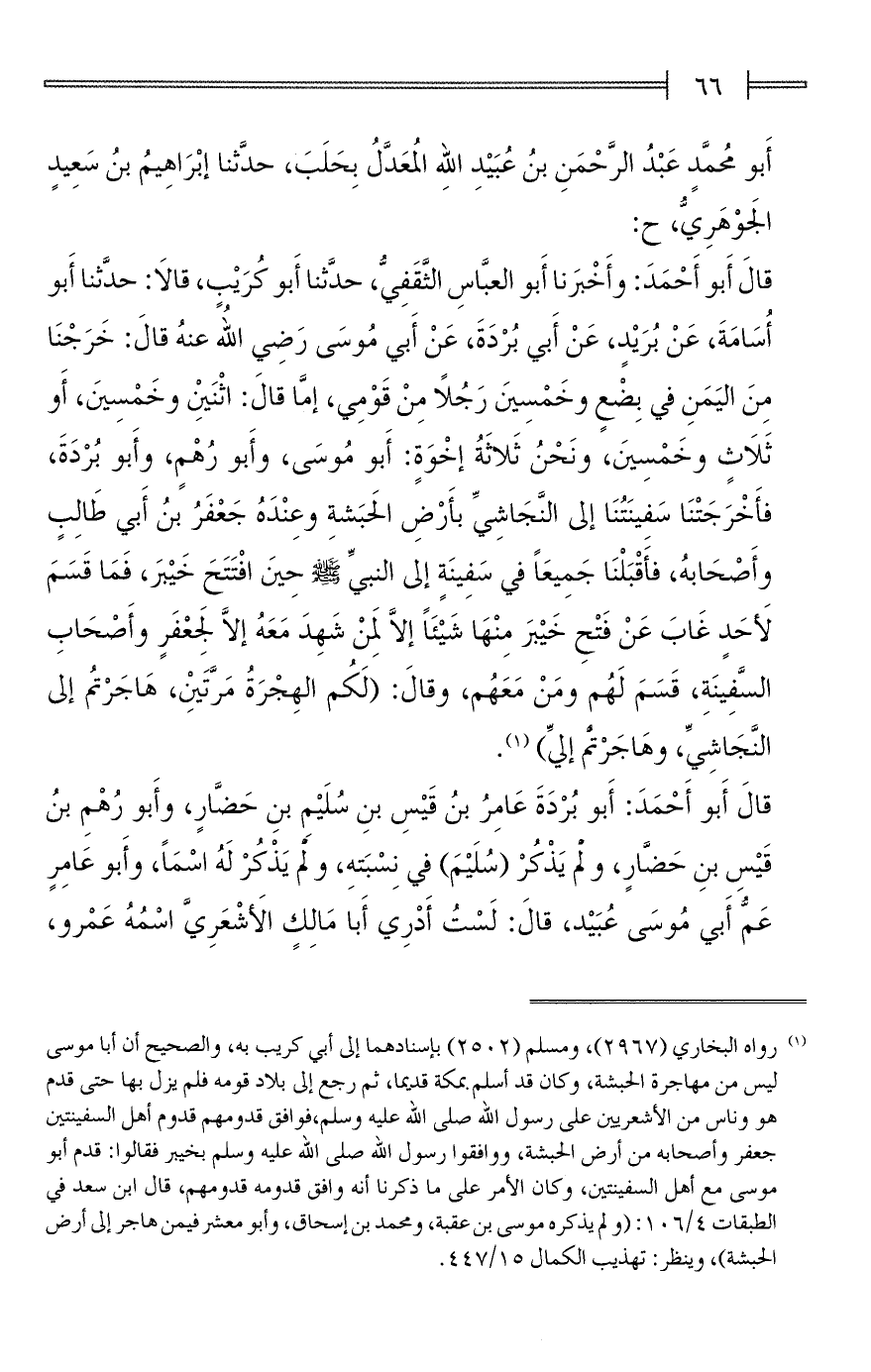 قالَ أَبو أَحْمَدَ: وأَخْبَرنا أَبو العبَّاسِ الثَّقَفِيُّ، حدَّثنا أَبو كُرَيْبٍ، قالَا: حدَّثنا أَبو أُسَامَةَ، عَنْ بُرَيْدٍ، عَنْ أَبي بُرْدَةَ، عَنْ أَبي مُوسَى رَضِي الله عنهُ قالَ: خَرَجْنَا مِنَ اليَمَنِ في بِضْعٍ وخَمْسِينَ رَجُلًا مِنْ قَوْمِي، إمَّا قالَ: اثْنَين وخَمْسِينَ، أَو ثَلَاثٍ وخَمْسِينَ، ونَحْنُ ثَلاثَةُ إخْوَةٍ: أَبو مُوسَى، وأَبو رُهْمٍ، وأَبو بُرْدَةَ، فأَخْرَجَتْنَا سَفِينَتُنَا إلى النَّجَاشِيِّ بأَرْضِ الحَبَشةِ وعِنْدَهُ جَعْفَرُ بَنُ أَبي طَالِبٍ وأَصْحَابهُ، فأَقْبَلْنَا جَمِيعًا في سَفِينَةٍ إلى النبيِّ - صلى الله عليه وسلم - حِينَ افْتَتَحَ خَيْبَر، فَمَا قَسَمَ لأَحَدٍ غَابَ عَنْ فَتْحِ خَيْبَر مِنْهَا شَيْئًا إلَّا لِمَنْ شَهِدَ مَعَهُ إلَّا لِجَعْفَرٍ وأَصْحَابِ السَّفِينَةِ، قَسَمَ لَهُم ومَنْ مَعَهُم، وقالَ: (لَكُم الهِجْرَةُ مَرَّتَينِ، هَاجَرْتمُ إلى النَّجَاشِيِّ، وهَاجَرْتم إليِّ) (¬1).