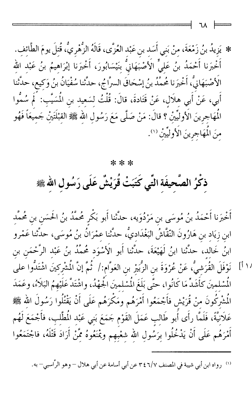 أَخْبَرنا أَحْمَدُ بنُ مُوسَى بنِ مَرْدُوَيه، حدَّثنا أَبو بَكْرٍ مُحمَّدُ بنُ الحَسَنِ بنِ مُحمَّدِ ابنِ زِيَادِ بنِ هَارُونَ النّقَّاشُ البَغْدَادِيُّ، حدَّثنا عِمْرَانُ بنُ مُوسَى، حدَّثنا عَمْرو ابنُ خَالِدِ، حدَّثنا ابنُ لَهَيْعَةَ، حدَّثنا أَبو الأَسْوَدِ مُحمَّدُ بنُ عَبْدِ الرَّحْمَنِ بنِ نَوْفَلَ القُرَشِىُّ، عَنْ عُرْوَةَ بنِ الزُّبَيْرِ بنِ العَوَّامِ: ثُمَّ إنَّ المُشرِكِينَ اشْتَدُّوا على المُسْلِمِينَ كأَشَدِّ مَا كَانُوا، حتَّى بَلَغَ المُسْلِمِينَ الجُهْدُ، واشْتَدَّ عَلَيْهِمُ البَلَاءُ، وعَمَدَ المُشْرِكُونَ مِنْ قُرَيْشٍ فأَجْمَعُوا أَمْرَهُم ومَكْرَهُم عَلَى أَنْ يَقْتُلُوا رَسُولَ اللهِ - صلى الله عليه وسلم - عَلَانِيَّةً، فَلَمَّا رأَى أَبو طَالِبٍ عَمَلَ القَوْمِ جَمَعَ بَنِي عَبْدِ المُطَّلِبِ، فأَجْمَعَ لَهُم أَمْرَهُم عَلَى أَنْ يَدْخُلُوا بِرَسُولِ الله شِعْبِهِم ويَمنَعُوهُ مِمَّنْ أَرَادَ قَتْلَهُ، فاجْتَمَعُوا