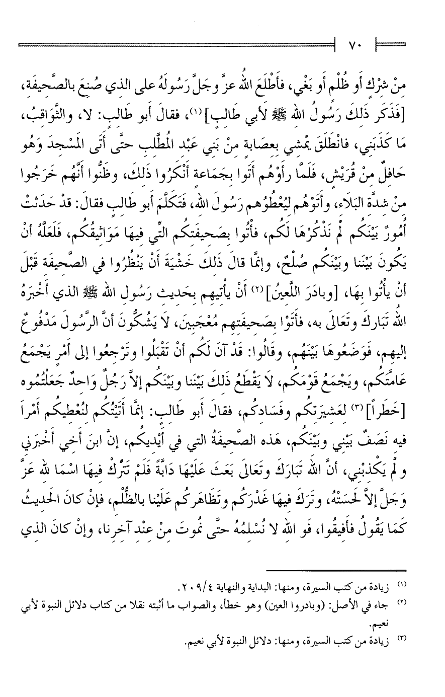 مِنْ شِرْكٍ أَو ظُلْمٍ أَو بَغْي، فأَطْلَعَ الله عزَّ وجَلَّ رَسُولَهُ على الذِي صُنِعَ بالصَّحِيفَةِ، [فَذَكَر ذَلِكَ رَسُولُ اللهِ -صلي الله عليه وسلم- لأَبي طَالِبٍ] (¬1)، فقالَ أَبو طَالِبٍ: لا، والثَّوَاقِبُ، مَا كَذَبَنِي، فانْطَلَقَ يَمشِي بِعِصَابةٍ مِنْ بَنِي عَبْدِ المُطَّلِبِ حتَّى أَتَى المَسْجِدَ وَهُو حَافِلٌ مِنْ قُرَيْشٍ، فَلَمَّا رأَوْهُم أَتَوا بِجَمَاعةٍ أَنْكَرُوا ذَلِكَ، وظَنُّوا أَنَّهُم خَرَجُوا مِنْ شِدَّةِ البَلَاءِ، وأَتَوْهُم لِيُعْطُوُهم رَسُولَ اللهِ، فَتَكَلَّمَ أَبو طَالِبٍ فقالَ: قدْ حَدَثتْ أُمُورٌ بَيْنَكُم لم نَذْكُرْهَا لَكُم، فأْتُوا بِصَحِيفَتِكُم التِّي فِيهَا مَوَاثِيقُكُم، فَلَعَلَّهُ أنْ يَكُونَ بَيْنَنا وبَيْنَكُم صُلْحٌ، وإنَّما قالَ ذَلِكَ خَشْيَةَ أَنْ يَنْظُرُوا في الصَّحِيفَةِ قَبْلَ أنْ يأْتُوا بِهَا، [وبادَرَ اللَّعِينُ] (¬2) أَنْ يأْتِيهِم بِحَدِيثِ رَسُولِ الله - صلى الله عليه وسلم - الذي أَخْبَرهُ الله تَبَاركَ وتَعَالىَ به، فأَتَوْا بِصَحِيفَتِهِم مُعْجَبِينَ، لَا يَشُكُّونَ أنَّ الرَّسُولَ مَدْفُوعٌ إليهِم، فَوَضَعُوهَا بَيْنَهُم، وقَالُوا: قَدْ آنَ لَكُم أنْ تَقْبَلُوا وتَرْجِعُوا إلى أَمْرٍ يَجْمَعُ عَامَّتَكُم، ويَجْمَعُ قَوْمَكُم، لَا يَقْطَعُ ذَلِكَ بَيْنَنا وبَيْنَكُم إلَّا رَجُلٌ وَاحِدٌ جَعَلْتُمُوه [خَطَرًا] (¬3) لِعَشِيرَتِكُم وفَسَادِكُم، فقالَ أَبو طَالِبِ: إنَّما أَتَيْتُكُم لِنُعْطِيكُم أَمْرَا فيه نَصَفٌ بَيْنِي وبَيْنَكُم، هَذه الصَّحِيفَةُ التي في أَيْدِيكُم، إنَّ ابنَ أَخِي أَخْبَرنيِ ولم يَكْذبْنِي، أنَّ الله تَبَارَكَ وتَعَالىَ بَعَثَ عَلَيْهَا دَابَّةً فَلَمْ تَتركْ فِيهَا اسْمَا للهِ عَزَّ وَجَلَّ إلَاَّ لحَسَتْهُ، وتَرَكَ فِيهَا غَدْرَكُم وتَظَاهَركُم عَلَيْنا بالظُّلْمِ، فإنْ كانَ الحَدِيثُ كَمَا يَقُولُ فأَفِيقُوا، فَوالله لا نُسْلِمُهُ حتَّى نمُوتَ مِنْ عِنْدِ آخِرِنا، وإنْ كانَ الذِي