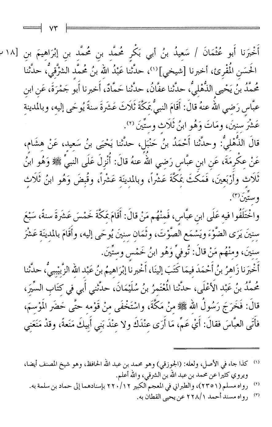 أَخْبَرنا أَبو عُثْمَانَ سَعِيدُ بنُ أبي بَكْرٍ مُحمَّدِ بنِ مُحمَّدِ بنِ إبْرَاهِيمَ بنِ الحَسَنِ المُقْرِئ، أخبرنا [شيخي] (¬1)، حدَّثنا عَبْدُ الله بنُ مُحمَّدٍ الشَّرْقِيُّ، حدَّثنا مُحمَّدُ بنُ يَحْيى الذُّهْلِيُّ، حدَّثنا عفَّانُ، حدَّثنا حَمَّادٌ، أَخبرنا أَبو جَمْرَةَ، عَنِ ابنِ عبَّاسٍ رَضِي الله عنهُ قالَ: أَقَامَ النبيُّ بِمَكَّةَ ثَلَاثَ عَشرَةَ سنةً يُوحَى إليهِ، وبالمدينةِ عَشْرَ سِنينَ، ومَاتَ وَهُو ابنُ ثَلَاثٍ وسِتِّينَ (¬2).