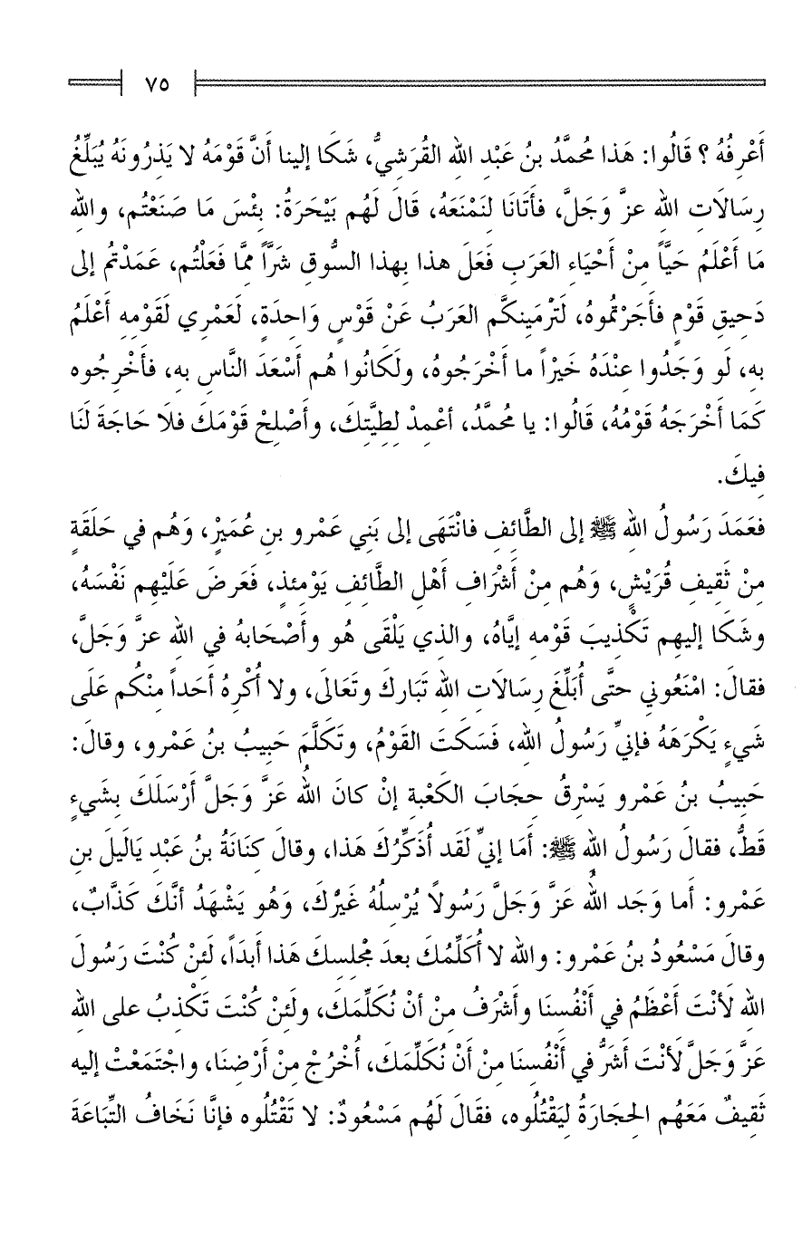فعَمَدَ رَسُولُ اللهِ - صلى الله عليه وسلم - إلى الطَّائِفِ فانْتَهَى إلى بَنِي عَمْرو بنِ عُمَيرٍ، وَهُم في حَلَقَةٍ مِنْ ثَقِيفِ قُرَيْشٍ، وَهُم مِنْ أَشرافِ أَهْلِ الطَّائِفِ يَوْمِئذٍ، فَعَرضَ عَلَيْهِم نَفْسَهُ، وشَكَا إليهِم تَكْذِيبَ قَوْمهِ إيَّاهُ، والذي يَلْقَى هُو وأَصْحَابهُ في الله عزَّ وَجَلَّ، فقالَ: امْنَعُونيِ حتَّى أُبَلِّغَ رِسَالاَتِ الله تَبَاركَ وتَعَالىَ، ولا أُكْرِهُ أَحَدًا مِنْكُم عَلَى شَىِءٍ يَكْرَهَهُ فإنيِّ رَسُولُ الله، فَسَكَتَ القَوْمُ، وتَكَلَّمَ حَبِيبُ بنُ عَمْرو، وقالَ: حَبِيبُ بنُ عَمْرو يَسرِقُ حِجَابَ الكَعْبةِ إنْ كانَ الله عَزَّ وَجَلَّ أَرْسَلَكَ بِشَيءٍ قَطُّ، فقالَ رَسُولُ الله - صلى الله عليه وسلم -: أَمَا إنِّي لَقَد أُذَكِّرُكَ هَذا، وقالَ كِنَانَةُ بنُ عَبْدِ يَالَيلَ بنِ عَمْرو: أَما وَجَد الله عَزَّ وَجَلَّ رَسُولًا يُرْسِلُهُ غَيرُكَ، وَهُو يَشْهَدُ أنَّكَ كَذَّابٌ، وقالَ مَسْعُودُ بنُ عَمْرو: والله لا أُكَلِّمُكَ بعدَ مجْلِسِكَ هَذا أَبدًا، لَئِنْ كُنْتَ رَسُولَ اللهِ لأَنْتَ أَعْظَمُ في أَنْفُسِنَا وأَشرفُ مِنْ أنْ نُكَلِّمَكَ، ولَئِنْ كُنْتَ تَكْذِبُ على الله عَزَّ وَجَلَّ لأَنْتَ أَشرُّ في أَنْفُسِنَا مِنْ أَنْ نُكَلِّمَكَ، أُخْرُجْ مِنْ أَرْضِنَا، واجْتَمَعْتْ إليه ثَقِيفٌ مَعَهُم الحِجَارَةُ لِيَقْتُلُوه، فقَالَ لَهُم مَسْعُودٌ: لا تَقْتُلُوه فإنَّا نَخَافُ التِّبَاعَةَ