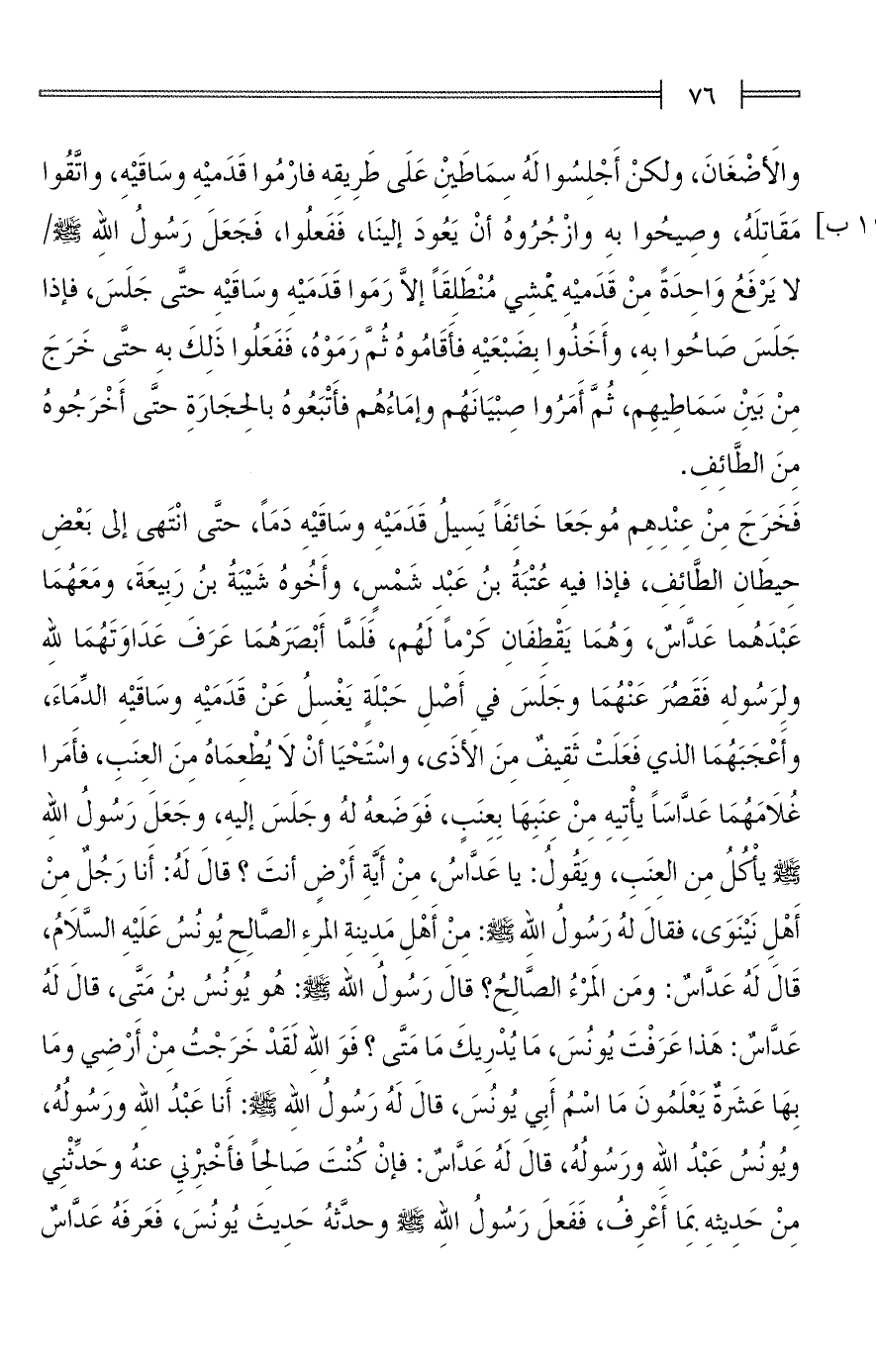 فَخَرَجَ مِنْ عِنْدِهِم مُوجَعَا خَائِفًا يَسِيلُ قَدَمَيْهِ وسَاقَيْهِ دَمًا، حتَّى انْتَهى إلى بَعْضِ حِيطَانِ الطَّائِفِ، فإذا فيهِ عُتْبَةُ بنُ عَبْدِ شَمْسٍ، وأَخُوهُ شَيْبَةُ بنُ رَبِيعَةَ، ومَعَهُمَا عَبْدَهُما عَدَّاسٌ، وَهُمَا يَقْطِفَانِ كَرْمًا لَهُم، فَلَمَّا أَبْصَرَهُمَا عَرَفَ عَدَاوَتَهُمَا لله ولِرَسُولهِ فَقَصُرَ عَنْهُمَا وجَلَسَ في أَصْلِ حَبْلَةٍ يَغْسِلُ عَنْ قَدَمَيْهِ وسَاقَيْهِ الدِّمَاءَ، وأَعْجَبَهُمَا الذي فَعَلَتْ ثَقِيفٌ مِنَ الأَذَى، واسْتَحْيَا أنْ لاَ يُطْعِمَاهُ مِنَ العِنَبِ، فأَمَرا غُلَامَهُمَا عَدَّاسًا يأْتِيهِ مِنْ عِنَبِهَا بِعِنَبٍ، فَوَضَعهُ لهُ وجَلَسَ إليهِ، وجَعَلَ رَسُولُ اللهِ - صلى الله عليه وسلم - يأكُلُ مِن العِنَبِ، ويَقُولُ: يا عَدَّاسُ، مِنْ أَيَّةِ أَرْضٍ أنتَ؟ قالَ لَهُ: أَنا رَجُلٌ مِنْ أَهْلِ نَيْنَوَى، فقالَ لهُ رَسُولُ الله - صلى الله عليه وسلم -: مِنْ أَهْلِ مَدِينة المرءِ الصَّالِحِ يُونُسُ عَلَيْهِ السَّلَامُ، قَالَ لَهُ عَدَّاسٌ: ومَن المَرْءُ الصَّالِحُ؟ قالَ رَسُولُ الله - صلى الله عليه وسلم -: هُو يُونُسُ بنُ مَتَّى، قالَ لَهُ عَدَّاسٌ: هَذا عَرَفْتَ يُونُسَ، مَا يُدْرِيكَ مَا مَتَّى؟ فَوَالله لَقَدْ خَرَجْتُ مِنْ أَرْضِي ومَا بِهَا عَشَرةٌ يَعْلَمُونَ مَا اسْمُ أَبِي يُونُسَ، قالَ لَهُ رَسُولُ الله - صلى الله عليه وسلم -: أَنا عَبْدُ اللهِ ورَسُولُهُ، ويُونُسُ عَبْدُ الله ورَسُولُهُ، قالَ لَهُ عَدَّاسٌ: فإنْ كُنْتَ صَالِحًا فأَخْبرنيِ عنهُ وحَدِّثْنِي مِنْ حَدِيثهِ بِمَا أَعْرِفُ، فَفَعلَ رَسُولُ اللهِ - صَلَّى اللهُ عليِّهِ وسلمَ - وحدِّثهُ حَدِيثَ يُونُسَ، فَعَرفَهُ عَدَّاسٌ