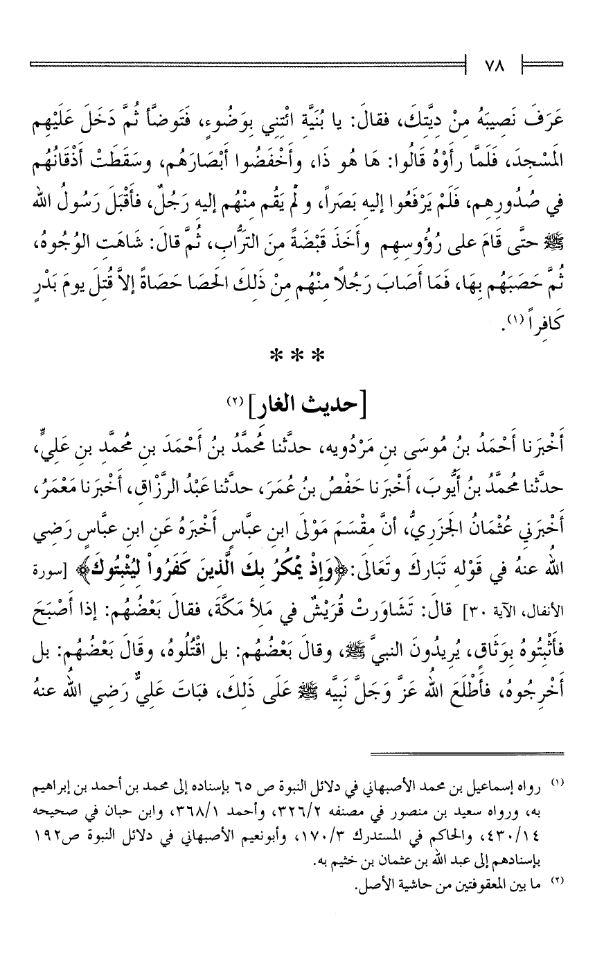 أَخْبَرنا أَحْمَدُ بنُ مُوسَى بنِ مَرْدُويه، حدَّثنا مُحمَّدُ بنُ أَحْمَدَ بنِ مُحمَّدِ بنِ عَلِيٍّ، حدَّثنا مُحمَّدُ بنُ أَيُّوبَ، أَخْبَرنا حَفْصُ بنُ عُمَرَ، حدَّثنا عَبْدُ الرَّزْاقِ، أَخْبَرنا مَعْمَرُ، أَخْبَرني عُثْمَانُ الجَزَرِيُّ، أنَّ مِقْسَمَ مَوْلى ابنِ عبَّاسٍ أَخْبَرهُ عَنِ ابنِ عبَّاسٍ رَضِي اللهِ عنهُ في قَوْله تَبَاركَ وتَعَالى: {وَإِذْ يَمْكُرُ بِكَ الَّذِينَ كَفَرُوا لِيُثْبِتُوكَ} [سورة الأنفال، الآية 30] قالَ: تَشَاوَرتْ قُرَيْشٌ في مَلأ مَكَّةَ، فقالَ بَعْضُهُم: إذا أَصْبَحَ فأَثْبِتُوهُ بِوَثَاقٍ، يُرِيدُونَ النبىَّ - صلى الله عليه وسلم -، وقالَ بَعْضُهُم: بل اقْتُلُوهُ، وقَالَ بَعْضُهُم: بل أَخْرِجُوهُ، فأَطْلَعَ الله عَزَّ وَجَلَّ نَبِيَّه - صلى الله عليه وسلم - عَلَى ذَلِكَ، فبَاتَ عَلِيٌّ رَضِي اللهِ عنهُ