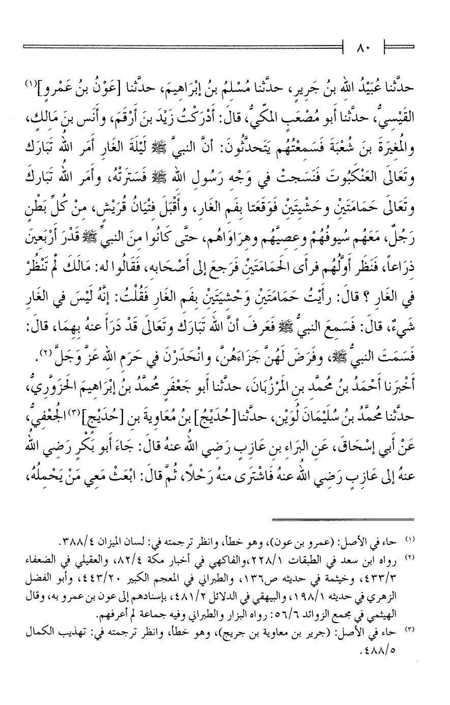 حدَّثنا عُبَيْدُ اللهِ بنُ جَرِيرٍ، حدَّثنا مُسْلِمُ بنُ إبْرَاهِيمَ، حدَّتنا [عَوْنُ بنُ عَمْروٍ] (¬1) القَيْسِيُّ، حدَّثنا أَبو مُصعَبٍ المكّيُّ، قالَ: أَدْرَكْتُ زَيْدَ بنَ أَرْقَمَ، وأَنَس بنَ مَاِلكٍ، والمُغِيرَةَ بنَ شُعْبَةَ فَسَمِعْتُهُم يَتَحدَّثُونَ: أنَّ النبيَّ - صلى الله عليه وسلم - لَيْلَةَ الغَارِ أَمَر اللهِ تَبَارَك وتَعَالى العَنْكَبُوتَ فَنَسَجتْ في وَجْهِ رَسُولِ اللهِ - صلى الله عليه وسلم - فَسَتَرتْهُ، وأَمَر اللهُ تَبَاركَ وتَعَالى حَمَامَتَين وحَشْيِتَينِ فَوَقَعَتا بِفَمِ الغَارِ، وأَقْبَلَ فِتْيَانُ قُرَيْشٍ، مِنْ كُلِّ بَطْنٍ رَجُلٌ، مَعَهُم سُيوفُهُمْ وعِصِيَّهُم وهِرَاوَاهُم، حتَّى كَانُوا مِنَ النبىِّ - صلى الله عليه وسلم - قَدْرَ أَرْبَعِينَ ذِرَاعًا، فَنَظَر أَوَّلُهُم فرأَى الحَمَامَتَين فَرَجعَ إلى أَصحَابه، فَقَالُوا له: مَالَكَ لمْ تَنْظُرْ في الغَارِ؟ قالَ: رأَيْت حَمَامَتَينِ وَحْشيَتَينِ بِفَمِ الغَارِ فَقُلْتُ: إنَّهُ لَيْسَ في الغَارِ شَيءٌ، قالَ: فَسَمِعَ النبيُّ - صلى الله عليه وسلم - فَعَرفَ أنَّ اللهِ تَبَارَك وتَعَالى قَدْ دَرَأَ عنهُ بِهِمَا، قالَ: فَسَمَتَ النبيُّ - صلى الله عليه وسلم -، وفَرَضَ لَهُنَّ جَزَاءَهُنَّ، وانْحَدَرْنَ في حَرَمِ اللهِ عَزَّ وَجَلَّ (¬2).