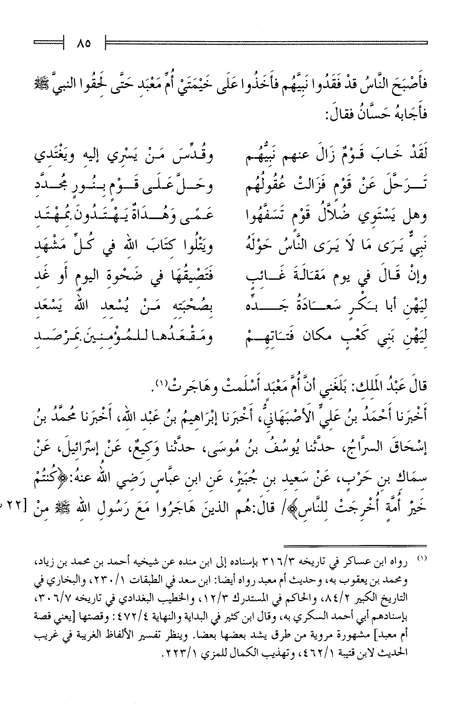 (¬1) رواه ابن عساكر في تاريخه 3/ 316 بإسناده إلى ابن منده عن شيخيه أحمد بن محمَّد بن زياد، ومحمد بن يعقوب به، وحديث أم معبد رواه أيضا: ابن سعد في الطبقات 1/ 230، والبخاري في التاريخ الكبير 2/ 84، والحاكم في المستدرك 3/ 12، والخطيب البغدادي في تاريخه 7/ 306، بإسنادهم أبى أحمد السكري به، وقال ابن كثير في البداية والنهاية 4/ 472: وقصتها [يعني قصة أم معبد] مشهورة مروية من طرق يشد بعضها بعضا. وينظر تفسير الألفاظ الغريبة في غريب الحديث لابن قتيبة 1/ 462، وتهذيب الكمال للمزي 1/ 223.