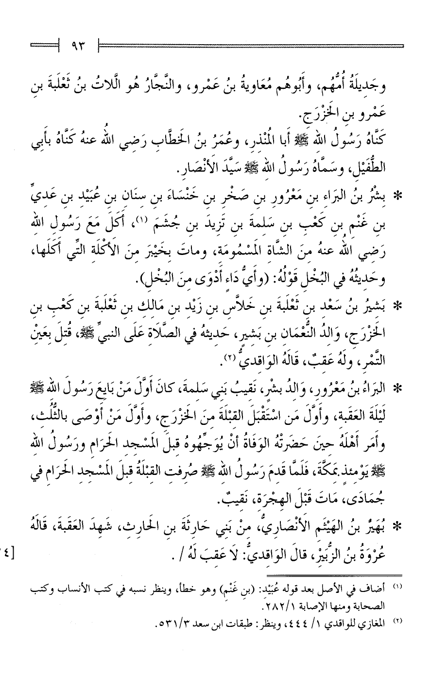 * البَراءُ بنُ مَعْرُورِ، وَالِدُ بشْرٍ، نَقِيبُ بَنِي سَلِمةَ، كانَ أَوَّلَ مَنْ بَايِعَ رَسُولَ اللهِ - صلى الله عليه وسلم - لَيْلَةَ العَقَبةِ، وأَوَّلَ مَن اسْتَقْبَلَ القِبْلَةَ مِنَ الخَزْرَجِ، وأَوَّلَ مَنْ أَوْصَى بالثُّلُثِ، وأَمَر أَهْلَهُ حينَ حَضَرتْهُ الوَفَاةُ أنْ يُوَجِّهُوهُ قِبلَ المَسْجِدِ الحَرَامِ ورَسُولُ اللهِ - صلى الله عليه وسلم - يَوْمِئذٍ بمَكَّةَ، فَلَمَّا قَدِمَ رَسُولُ اللهِ - صلى اللهِ عليه وسلم - صُرِفتِ القِبْلَةُ قِبلَ المَسْجِدِ الحَرَامِ في جُمَادَى، مَاتَ قَبْلَ الهِجْرَةِ، نَقِيبٌ.