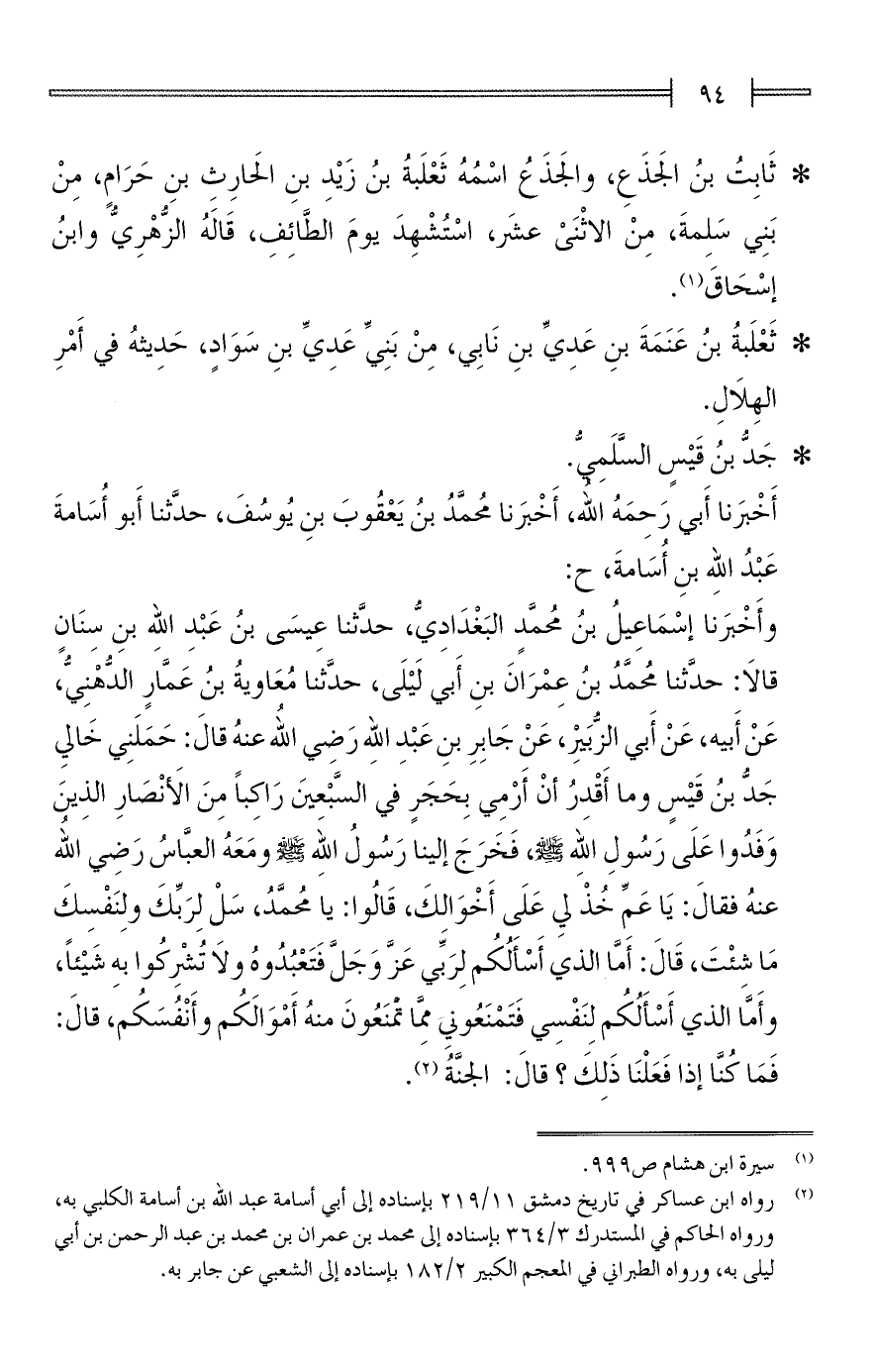 وأَخْبَرنا إسْمَاعِيلُ بنُ مُحمَّد البَغْدَادِيُّ، حدَّثنا عِيسَى بنُ عَبْدِ اللهِ بنِ سِنَانٍ قالَا: حدَّثنا مُحمَّدُ بنُ عِمْرَاَنَ بنِ أَبي لَيْلَى، حدَّثنا مُعَاويةُ بنُ عَمَّارٍ الدُّهْنِيُّ، عَنْ أَبيه، عَنْ أَبي الزُّبَيرِ، عَنْ جَابِرِ بنِ عَبْدِ اللهِ رَضي اللهِ عنهُ قالَ: حَمَلَنِي خَالي جَدُّ بنُ قَيْسٍ وما أَقْدِرُ أنْ أَرْمِىِ بِحَجَرٍ في السَّبعِينَ رَاكِبًا مِنَ الأَنْصَارِ الذِينَ وَفَدُوا عَلَى رَسُولِ اللهِ - صلى الله عليه وسلم -، فَخَرَجَ إلينا رَسُولُ اللهِ - صلى الله عليه وسلم - ومَعَهُ العبَّاسُ رَضِي اللهِ عنهُ فقالَ: يَا عَمِّ خُذْ لي عَلَى أَخْوَالِكَ، قَالُوا: يا مُحمَّدُ، سَلْ لِرَبِّكَ ولِنَفْسِكَ مَا شِئْتَ، قَالَ: أَمَّا الذي أَسْأَلُكُم لِرَبِّي عَزَّ وَجَلَّ فَتَعْبُدُوهُ ولَا تُشَركُوا بهِ شَيْئًا، وأَمَّا الذي أَسْأَلُكُم لِنَفْسِي فَتَمْنَعُونيِ مِمَّا تمنَعُونَ منهُ أَمْوَالَكُم وأَنْفُسَكُم، قالَ: فَمَا كُنَّا إذا فَعَلْنَا ذَلِكَ؟ قالَ: الجنَّةُ (¬2).