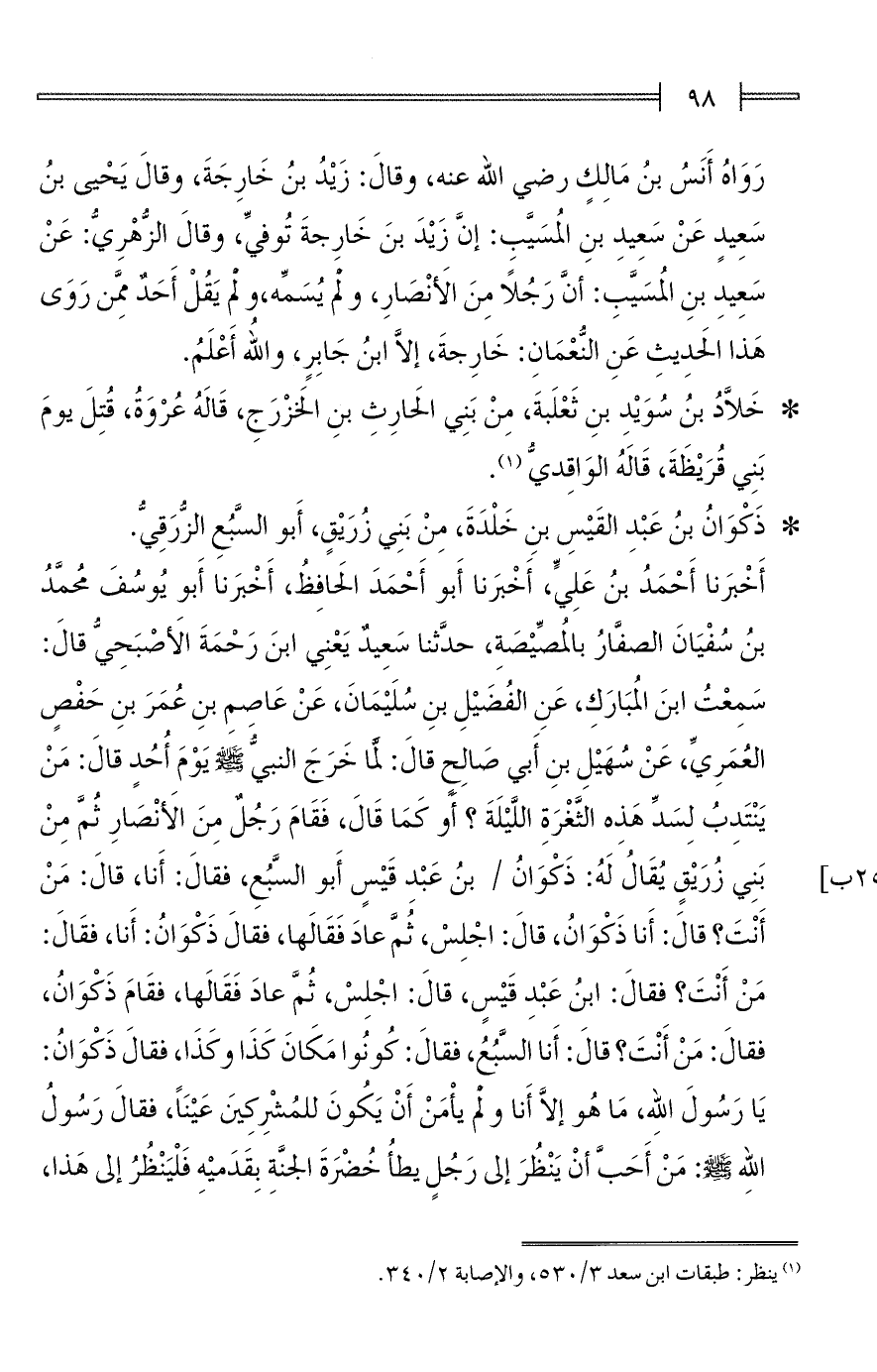 أَخْبَرنا أَحْمَدُ بنُ عَلِيٍّ، أَخْبَرنا أَبو أَحْمَدَ الحَافِظُ، أَخْبَرنا أَبو يُوسُفَ مُحمَّدُ بنُ سُفْيَانَ الصفَّارُ بالمُصِّيْصَةِ، حدَّثنا سَعِيدٌ يَعْنِي ابنَ رَحْمَةَ الأَصْبَحِيُّ قالَ: سَمِعْتُ ابنَ المُبَارَكِ، عَنِ الفُضَيْلِ بنِ سُلَيْمَانَ، عَنْ عَاصِمِ بنِ عُمَرَ بنِ حَفْصٍ العُمَرِيِّ، عَنْ سُهَيْلِ بنِ أَبي صَالِحٍ قالَ: لمَّا خَرَجَ النبيُّ - صلى الله عليه وسلم - يَوْمَ أُحُدٍ قالَ: مَنْ يَنْتَدِبُ لِسَدِّ هَذِه الثَّغْرَةِ اللَّيْلَةَ؟ أو كَمَا قَالَ، فَقَامَ رَجُلٌ مِنَ الأَنْصَارِ ثُمَّ مِنْ بَنِي زُرَيْقٍ يُقَالُ لَهُ: ذَكْوَانُ بنُ عَبْدِ قَيْسٍ أَبو السَّبُعِ، فقالَ: أَنا، قالَ: مَنْ أَنْتَ؟ قالَ: أَنا ذَكْوَانُ، قالَ: اجْلِسْ، ثُمَّ عادَ فَقَالَها، فقالَ ذَكْوَانُ: أَنا، فقَالَ: مَنْ أَنْتَ؟ فقالَ: ابنُ عَبْدِ قَيْسٍ، قالَ: اجْلِسْ، ثُمَّ عادَ فَقَالَها، فقَامَ ذَكْوَانُ، فقالَ: مَنْ أَنْتَ؟ قالَ: أَنا السَّبُعُ، فقالَ: كُونُوا مَكَانَ كَذَا وكَذَا، فقالَ ذَكْوَانُ: يَا رَسُولَ اللهِ، مَا هُو إلَّا أَنا ولَمْ يأْمَنْ أَنْ يَكُونَ للمُشركِينَ عَيْنًا، فقالَ رَسُولُ اللهِ - صلى الله عليه وسلم -: مَنْ أَحَبَّ أنْ يَنْظُرَ إلى رَجُلٍ يطأُ خُضْرَةَ الجنَّةِ بِقَدَميْهِ فَلْيَنْظُرُ إلى هَذا،