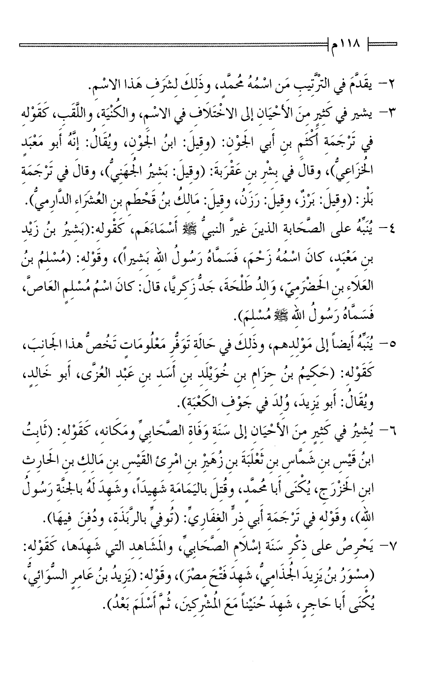 4 - يُنَبِّهُ على الصَّحَابةِ الذينَ غيَّر النبيُّ - صلى الله عليه وسلم - أَسْمَاءَهَم، كَقولهِ: (بَشِيرُ بنُ زَيْدِ بنِ مَعْبَدٍ، كانَ اسْمُهُ زَحْمَ، فَسَمَّاهُ رَسُولُ اللهِ بَشِيرًا)، وقَوْلهِ: (مُسْلِمُ بنُ العَلَاءِ بنِ الحَضرَمِيّ، وَالِدُ طَلْحَةَ، جَدُّ زَكِريَّا، قالَ: كانَ اسْمُ مُسْلِمٍ العَاصَّ، فَسَمَّاهُ رَسُولُ اللهِ - صلى الله عليه وسلم - مُسْلِمَ).