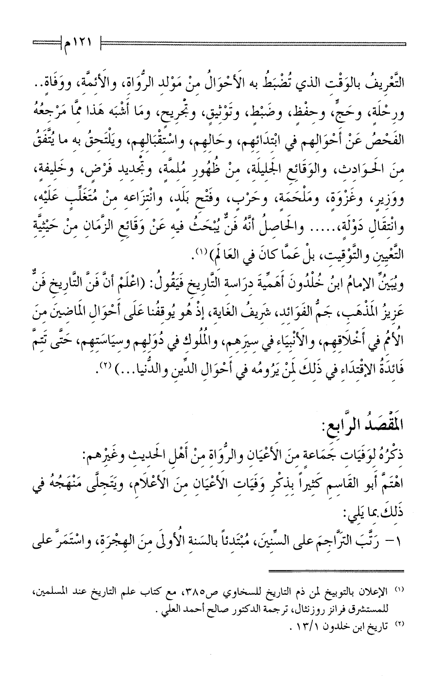 (¬1) الإعلان بالتوبيخ لمن ذم التاريخ للسخاوي ص 385، مع كتاب علم التاريخ عند المسلمين، للمستشرق فرانز روزنثال، ترجمة الدكتور صالح أحمد العلى.