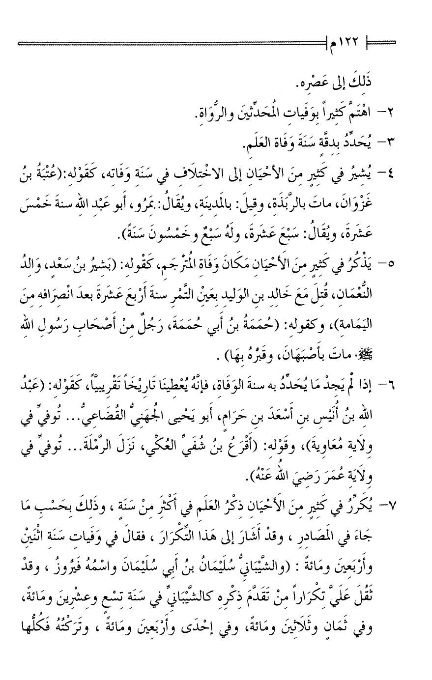 6 - إذا لمْ يَجِدْ مَا يُحَدِّدُ به سنةَ الوَفَاةِ، فإنَّهُ يُعْطِينَا تَارِيْخًا تَقْرِيبيًّا، كَقَوْله: (عَبْدُ اللهِ بنُ أُنَيْسِ بنِ أَسْعَدَ بنِ حَرَامٍ، أَبو يَحْيى الجُهَنِيُّ القُضَاعِيُّ ... تُوفيِّ في وِلَايةِ مُعَاوِيةَ)، وقَوْله: (أَقْرَعُ بنُ شُفَيِّ العُكِّي، نَزَلَ الرَّمْلَةَ ... تُوفيِّ في وِلَايَةِ عُمَرَ رَضِيَ اللهِ عَنْهُ).