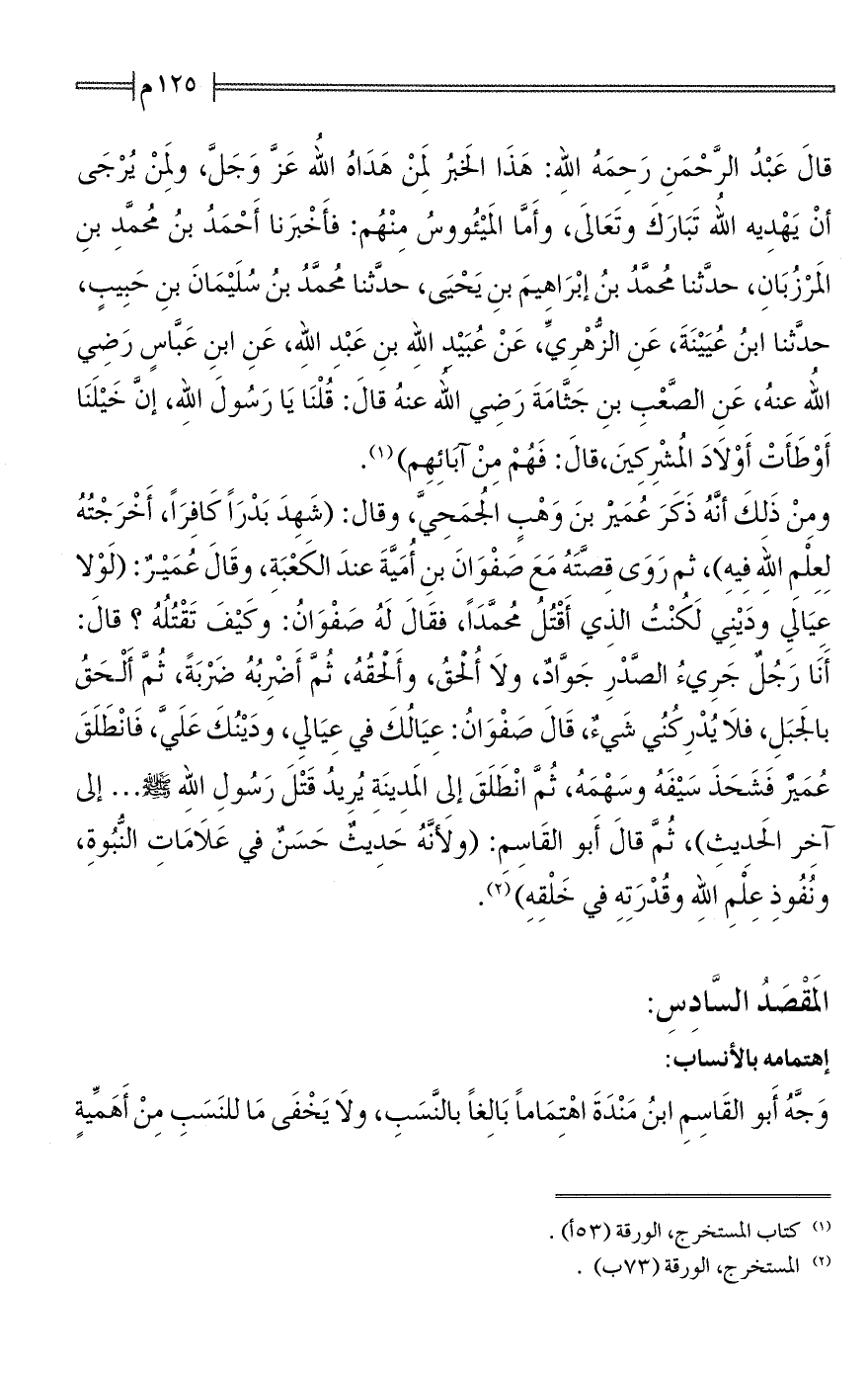 قالَ عَبْدُ الرَّحْمَنِ رَحِمَهُ اللهِ: هَذَا الخَبرُ لِمَنْ هَدَاهُ اللهُ عَزَّ وَجَلَّ، ولِمَنْ يُرْجَى أنْ يَهْدِيه اللهُ تَبَارَكَ وتَعَالىَ، وأَمَّا المَيْئُووسُ مِنْهُم: فأَخْبَرنا أَحْمَدُ بنُ مُحمَّدِ بنِ المَرْزُبَانِ، حدَّثنا مُحمَّدُ بنُ إبْرَاهيمَ بنِ يَحْيَى، حدَّثنا مُحمَّدُ بنُ سُلَيْمَانَ بنِ حَبِيبٍ، حدَّثنا ابنُ عُيَيْنَةَ، عَنِ الزُّهْرِيِّ، عَنْ عُبَيْدِ اللهِ بنِ عَبْدِ اللهِ، عَنِ ابنِ عَبَّاسٍ رَضِي اللهُ عنهُ، عَنِ الصَّعْبِ بنِ جَثَّامَةَ رَضِي اللهُ عنهُ قالَ: قُلْنَا يَا رَسُولَ اللهِ، إنَّ خَيْلَنَا أَوْطَأَتْ أَوْلَادَ المُشْرِكِينَ، قالَ: فَهُمْ مِنْ آبَائِهِم) (¬1).