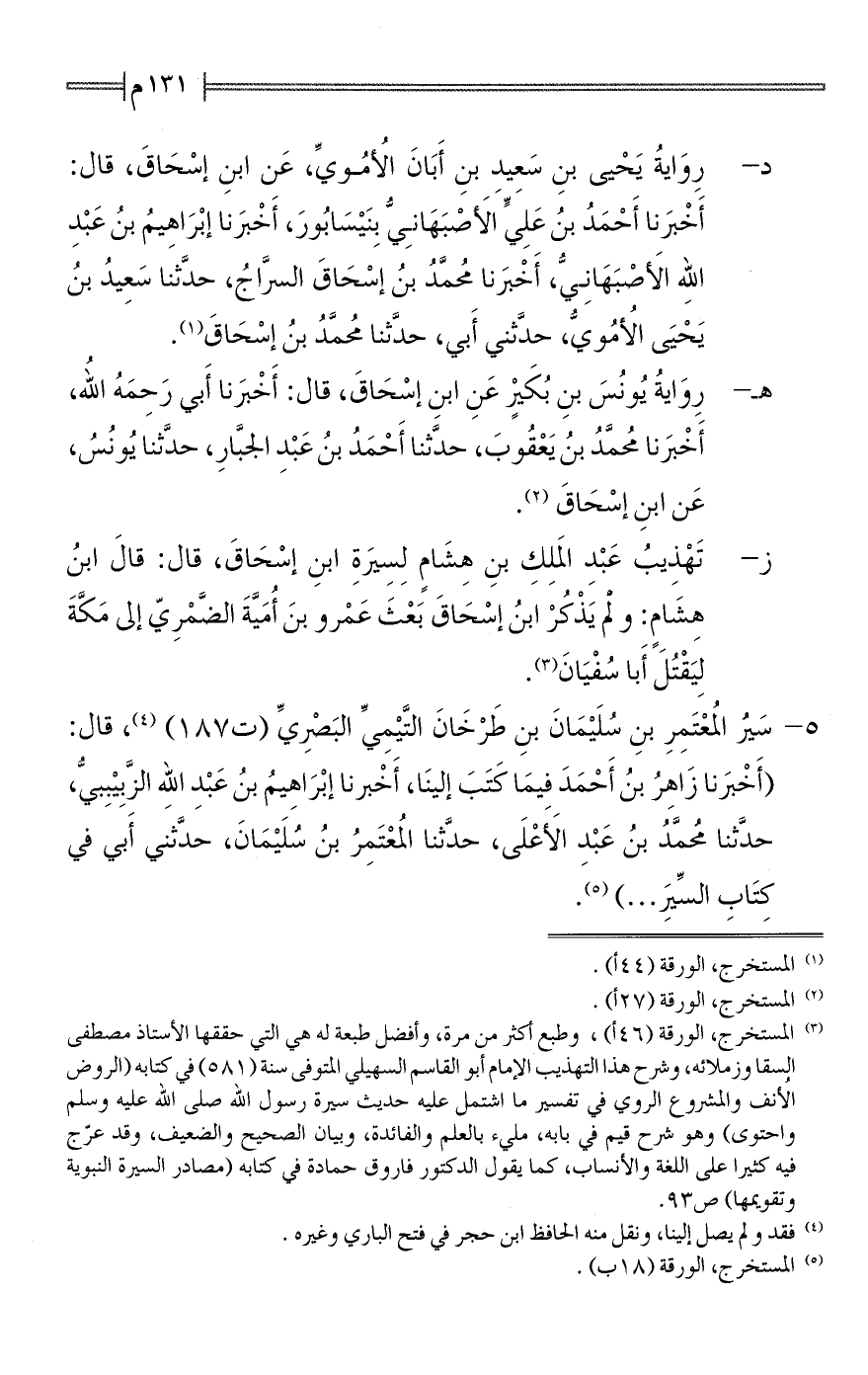 (¬3) المستخرج، الورقة (46 أ)، وطبع أكثر من مرة، وأفضل طبعة له هي التي حققها الأستاذ مصطفى السقا وزملائه، وشرح هذا التهذيب الإِمام أبو القاسم السهيلي المتوفى سنة (581) في كتابه (الروض الأنف والمشروع الروي في تفسير ما اشتمل عليه حديث سيرة رسول الله صلى الله عليه وسلم واحتوى) وهو شرح قيم في بابه، مليء بالعلم والفائدة، وبيان الصحيح والضعيف، وقد عرّج فيه كثيرا على اللغة والأنساب، كما يقول الدكتور فاروق حمادة في كتابه (مصادر السيرة النبوية وتقويمها) ص 93.