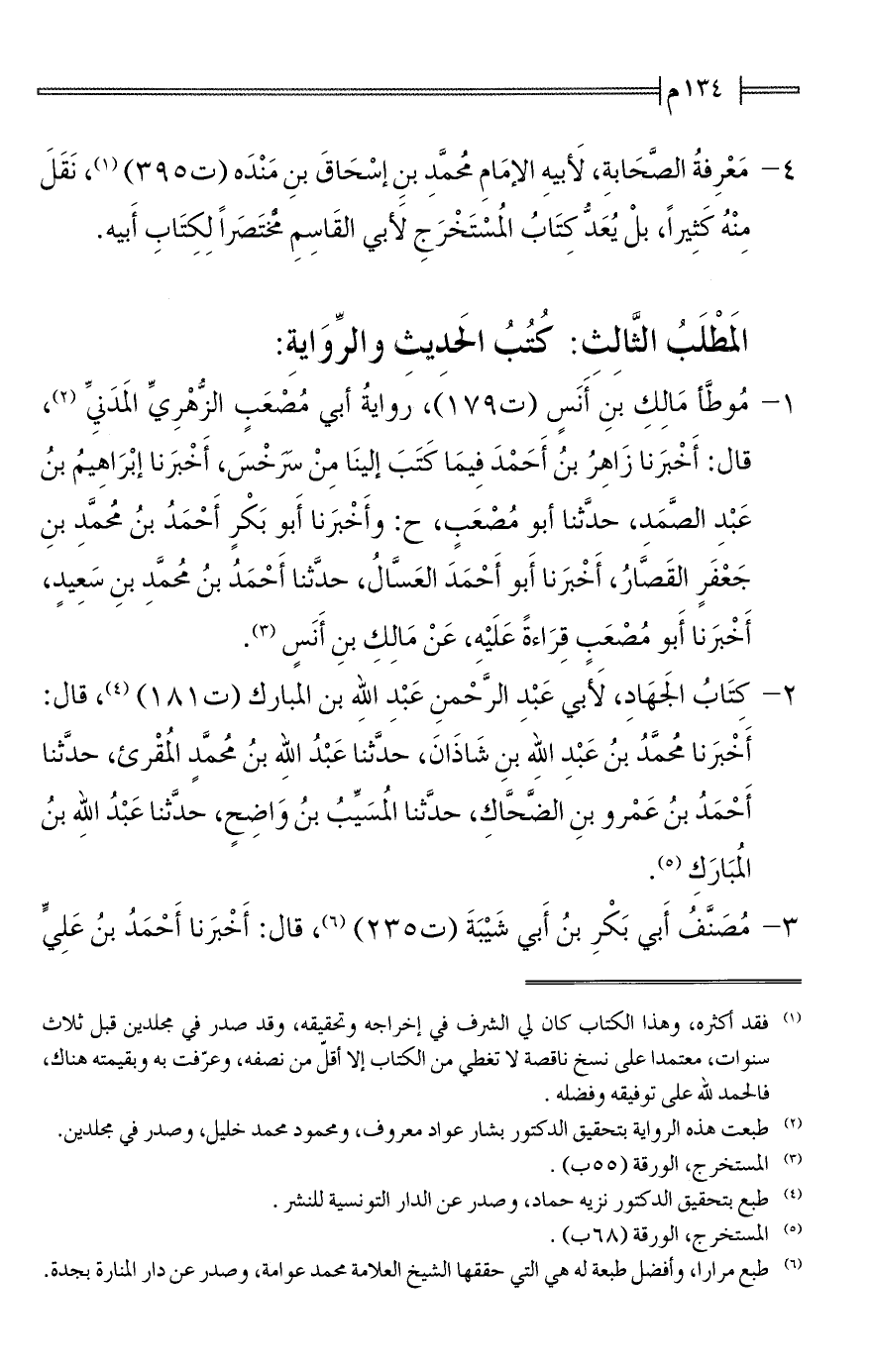 1 - مُوطَّأ مَالِكِ بَنِ أَنَسٍ (ت 179)، روايةُ أبي مُصعَبٍ الزُّهْرِيِّ المَدَنِيِّ (¬2)، قال: أَخْبَرنا زَاهِرُ بنُ أَحَمْدَ فِيمَا كَتَبَ إلينَا مِنْ سَرَخْسَ، أَخْبَرنا إبْرَاهِيمُ بنُ عَبْدِ الصَّمَد، حدَّثنا أبو مُصعَبٍ، ح: وأَخْبَرنا أَبو بَكْرٍ أَحْمَدُ بنُ مُحمَّدِ بنِ جَعْفَرٍ القَصَّارُ، أَخْبَرنا أَبو أَحْمَدَ العَسَّالُ، حدَّثنا أَحْمَدُ بنُ مُحمَّدِ بنِ سَعِيدٍ، أَخْبَرنا أَبو مُصعَبٍ قِرَاءةً عَلَيْهِ، عَنْ مَالِكِ بنِ أَنَسٍ (¬3).
