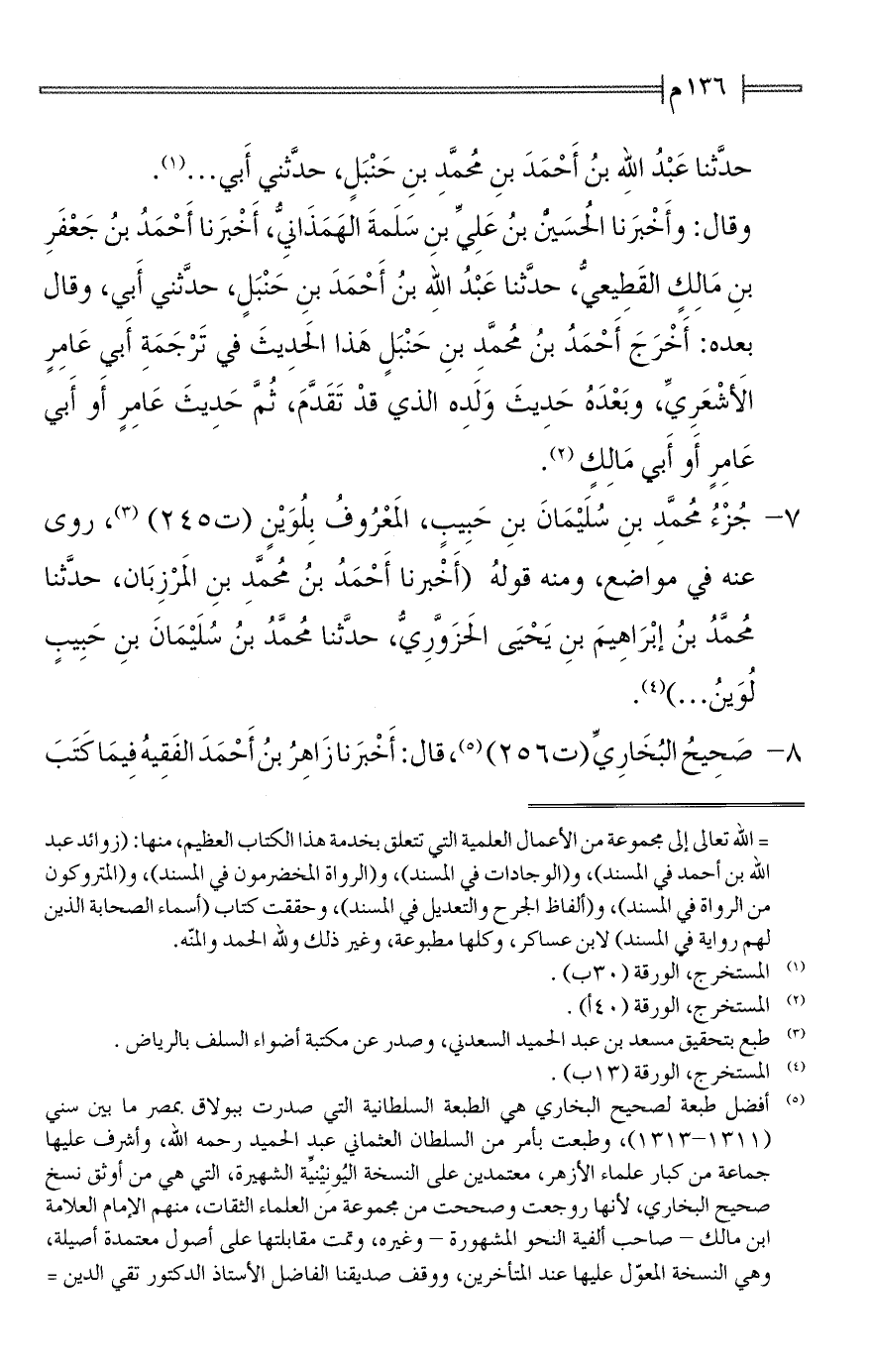 (¬5) أفضل طبعة لصحيح البخاري هى الطبعة السلطانية التي صدرت ببولاق بمصر ما بين سني (1311 - 1313)، وطبعت بأمر من السلطان العثماني عبد الحميد رحمه الله، وأشرف عليها جماعة من كبار علماء الأزهر، معتمدين على النسخة اليُونِيْنيِّة الشهيرة، التي هي من أوثق نسخ صحيح البخاري، لأنها روجعت وصححت من مجموعة من العلماء الثقات، منهم الإِمام العلامة ابن مالك -صاحب ألفية النحو المشهورة- وغيره، وتمت مقابلتها على أصول معتمدة أصيلة، وهي النسخة المعوّل عليها عند المتأخرين، ووقف صديقنا الفاضل الأستاذ الدكتور تقي الدين =