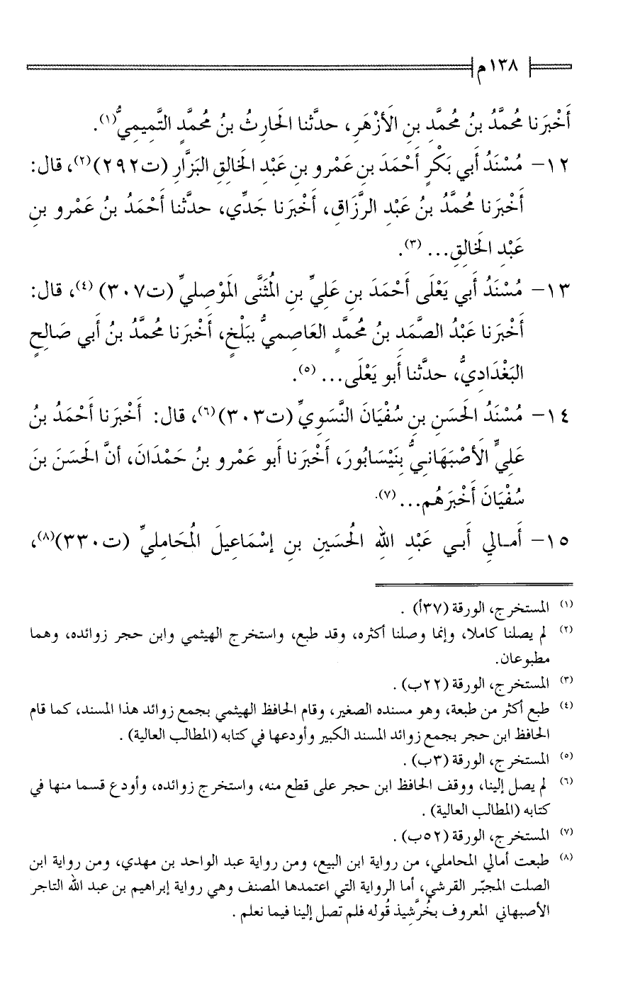 (¬4) طبع أكثر من طبعة، وهو مسنده الصغير، وقام الحافظ الهيثمي بجمع زوائد هذا المسند، كما قام الحافظ ابن حجر بجمع زوائد المسند الكبير وأودعها في كتابه (المطالب العالية).