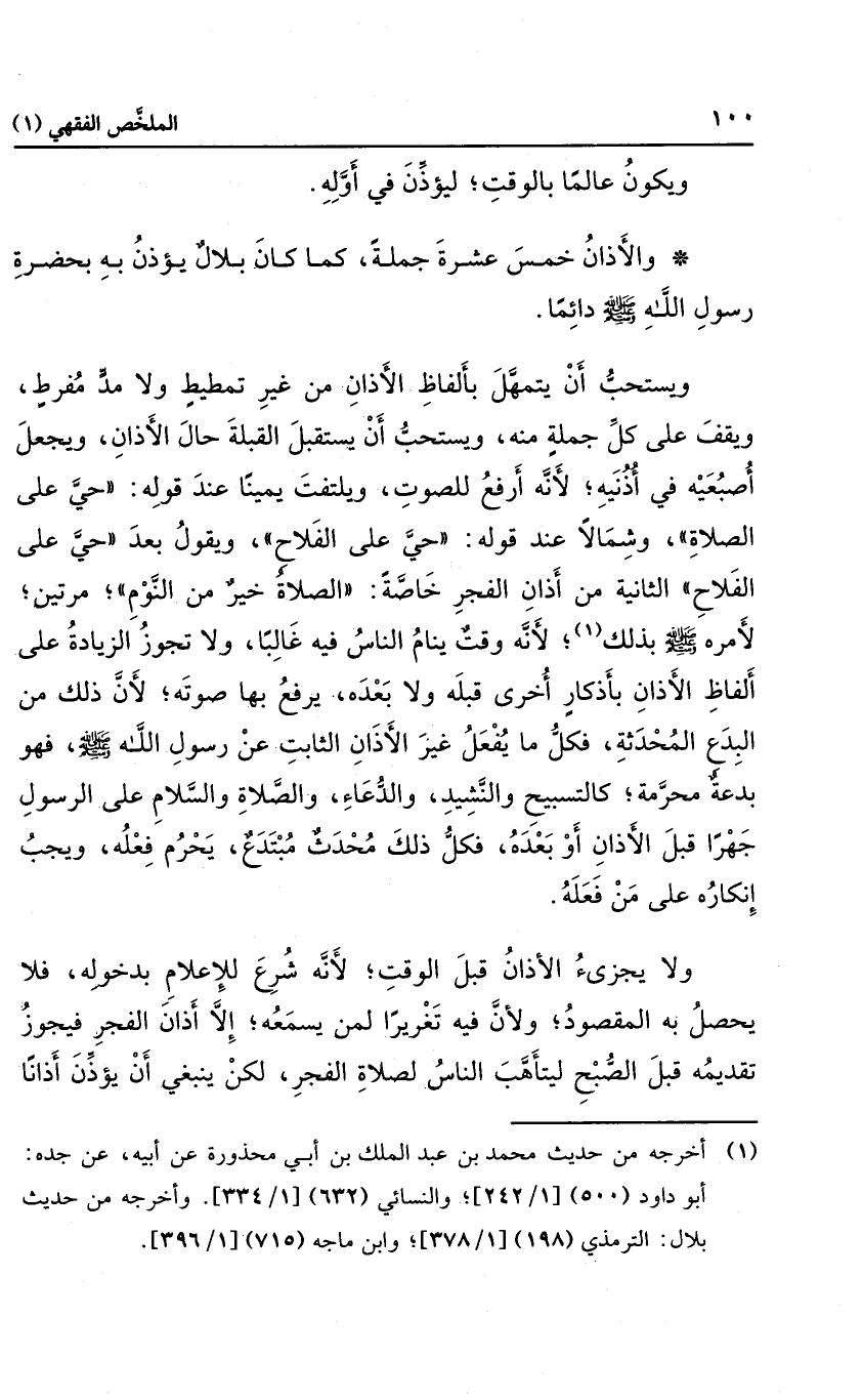 والأذان خمس عشرة جملة، كما كان بلال يؤذن به بحضرة رسول الله دائما، ويستحب أن يتمهل بألفاظ الأذان من غير تمطيط ولا مد مفرط، ويقف على كل جملة منه، ويستحب أن يستقبل القبلة حال الأذان، ويجعل إصبعيه في أذنيه؛ لأنه أرفع للصوت، ويلتفت يمينا عند قوله: "حي على الصلاة"، وشمالاً عند قوله: "حي إلى الفلاح"، ويقول بعد "حي على الفلاح الثانية" من أذان الفجر خاصة: "الصلاة خير من النوم"، مرتين؛ لأمره بذلك؛ لأنه وقت ينام الناس فيه غالبا، ولا يجوز الزيادة على ألفاظ الأذان بأذكار أخرى قبله ولا بعده، يرفع بها صوته؛ لأن ذلك من البدع المحدثة؛ فكل ما يفعل غير الأذان الثابت عن رسول الله؛ فهو بدعة محرمة؛ كالتسبيح، والنشيد، والدعاء، والصلاة والسلام على الرسول جهراً قبل الأذان أو بعده، كل ذلك محدث مبتدع، يحرم فعله، ويجب إنكاره على من فعله.