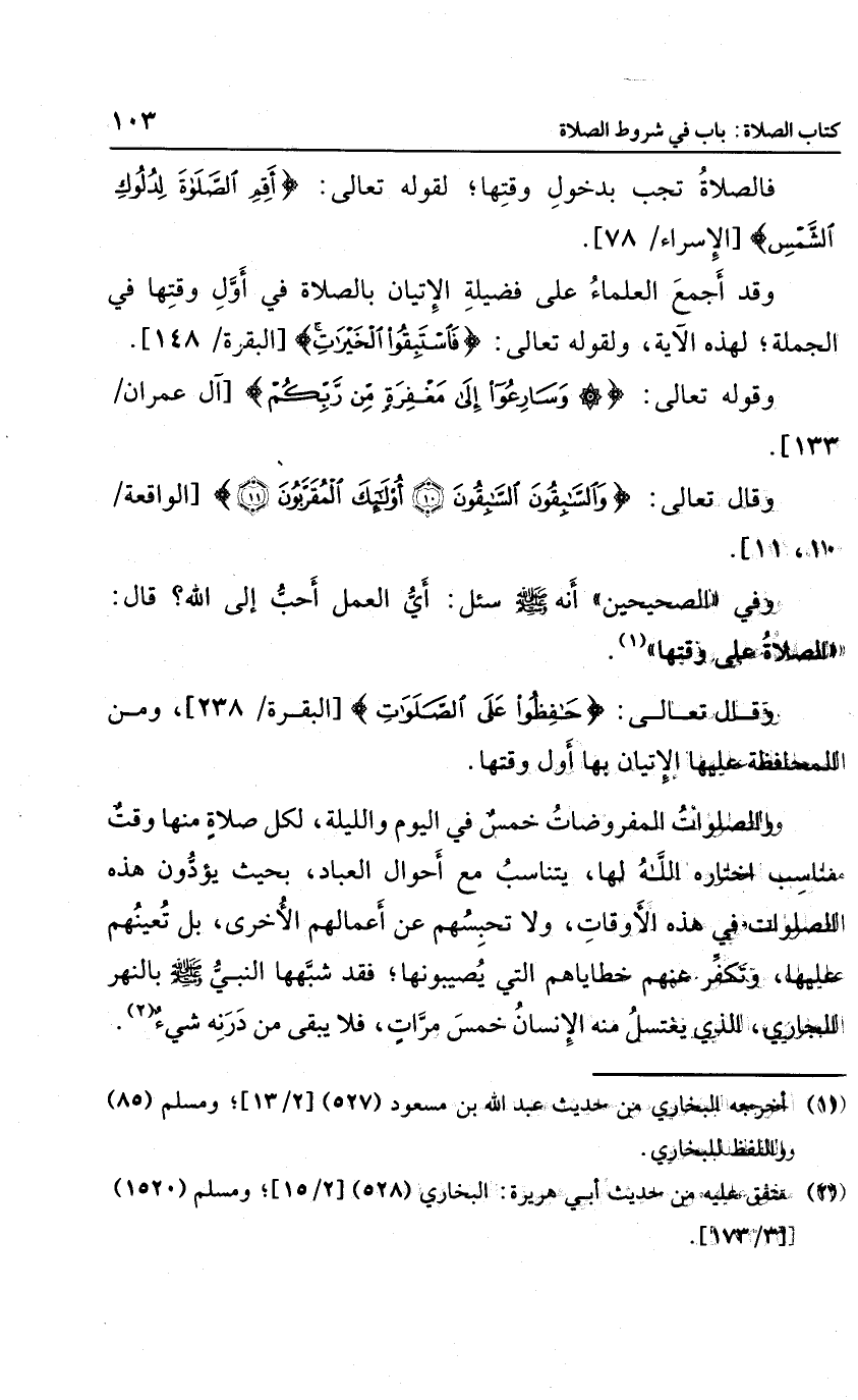 وفي الصحيحين أنه سئل: أي العمل أحب إلى الله؟ قال: "الصلاة على وقتها"، وقال تعالى: {حَافِظُوا عَلَى الصَّلَوَاتِ} ، ومن المحافظة عليها: الإتيان بها أول وقتها.