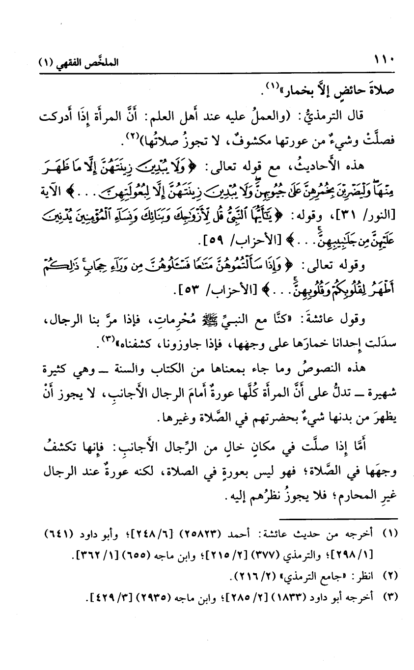 صلاة حائض إلا بخمار"، قال الترمذي: "والعمل عليه عند أهل العلم؛ أن المرأة إذا أدركت فصلت وشيء من عورتها مكشوف؛ لا تجوز صلاتها ".