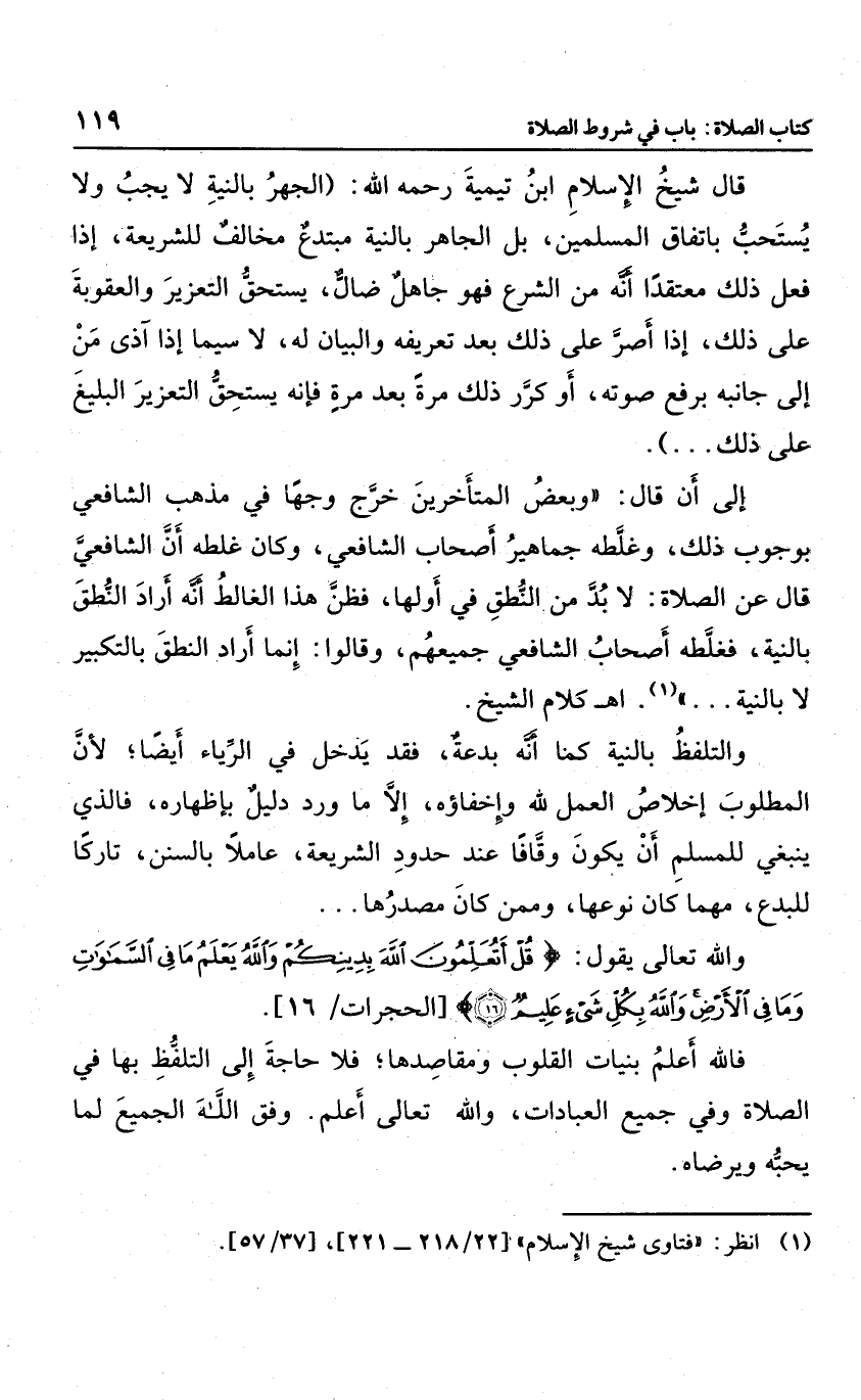 قال شيخ الإسلام ابن تيمية رحمه الله: "اتفق الأئمة أنه لا يشرع الجهر بها ولا تكريرها، بل من اعتاده ينبغي تأديبه، والجاهر بها مستحق للتعزير بعد تعريفه، لا سيما إذا آذى به أو كرره ... " إلى أن قال: "بعض المتأخرين خرج وجها من مذهب الشافعي في ذلك، وغلطه جماهير أصحاب الشافعي، قال الشافعي، قال الشافعي: إن الصلاة لا بد من النطق في أولها، فظن الغالط أنه أراد النطق في أولها، فظن الغالط أنه أراد النطق بالنية، وإنما أراد التكبير " اه كلام الشيخ.