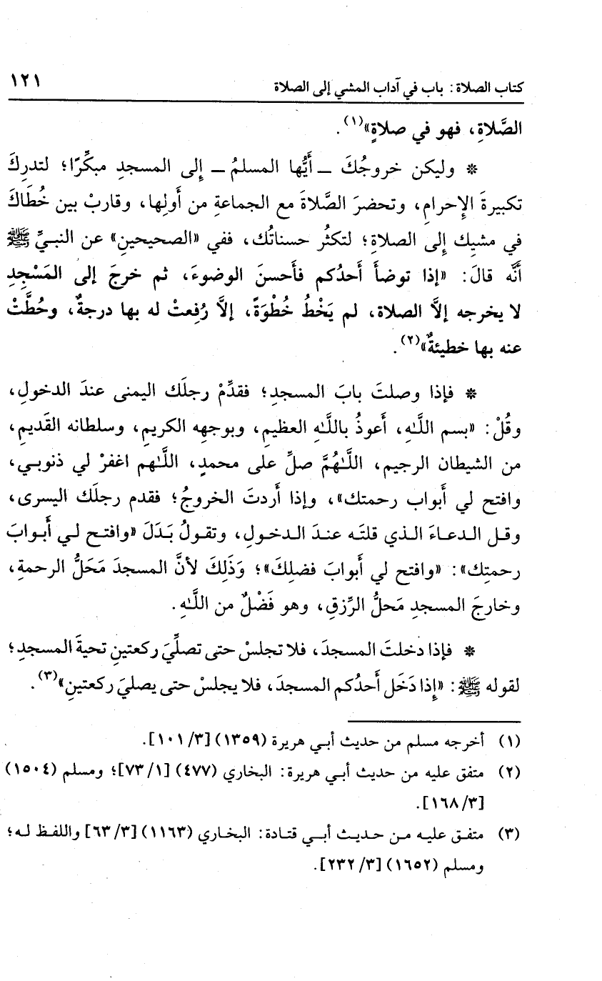 وليكن خروجك أيها المسلم إلى المسجد مبكراً؛ لتدرك تكبيرة الإحرام، وتحضر الصلاة مع الجماعة من أولها، وقارب بين خطاك في مشيك إلى الصلاة؛ لتكثر حسناتك؛ ففي "الصحيحين" عن النبي؛ أنه قال: "إذا توضأ أحدكم فأحسن الوضوء، ثم خرج إلى المسجد؛ لم يخط خطوة؛ إلا رفعت له بها درجة، وحطت عنه بها خطيئة".