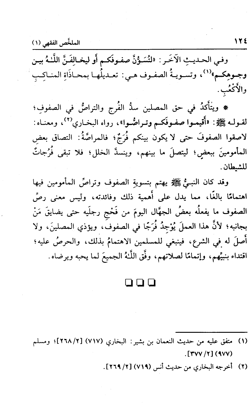 وقد كان النبي يهتم بتسوية الصفوف وتراص المأمومين فيها اهنماما بالغا؛ مما يدل على أهمية ذلك وفائدته، وليس معنى رص الصفوف ما يفعله بعض الجهال اليوم من فحج رجليه حتى يضايق من بجانبه؛ لأن هذا العمل يوجد فرجا في الصفوف1، ويؤذي المصلين، ولا أصل له في الشرع؛ فينبغي للمسلمين الاهتمام بذلك، والحرص عليه؛ اقتداء بنبيهم، وإتماما لصلاتهم، وفق الله الجميع لما يحبه ويرضاه.
