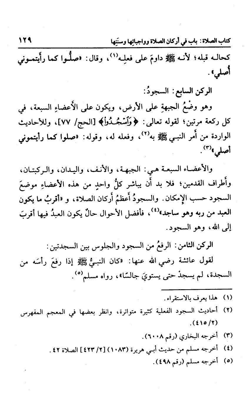 الركن السابع: السجود، وهو وضع الجبهة على الأرض، ويكون على الأعضاء السبعة، في كل ركعة مرتين؛ لقوله تعالى: {وَاسْجُدُوا} ، وللأحاديث الواردة من أمر النبي به، وفعله له، وقوله: "صلوا كما رأيتموني أصلي".