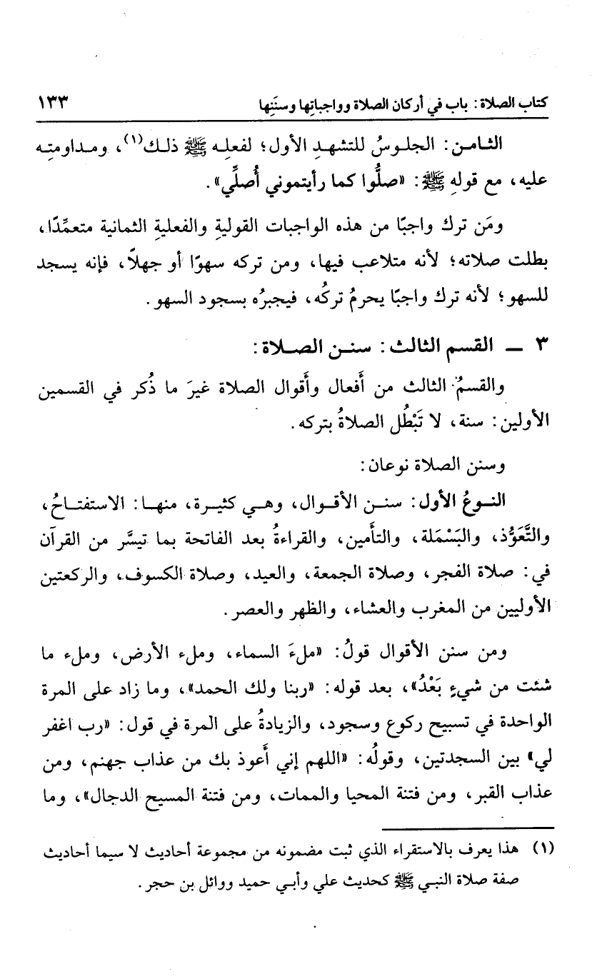 والقسم الثالث أفعال وأقوال الصلاة غير ما ذكر في القسمين الأولين: سنة، لا تبطل الصلاة بتركه.