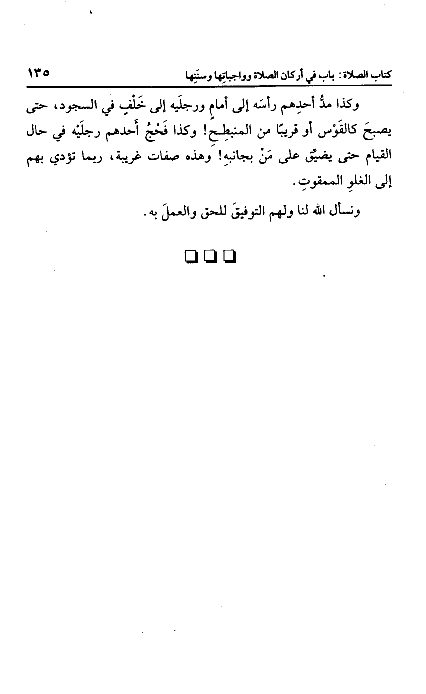 وكذا مد أحدهم رأسه إلى أمام ورجليه إلى خلف في السجود، حتى يصبح كالقوس أو قريبا من المنبطح، وكذا فحج أحدهم رجليه في حال القيام حتى يضيِّق على من بجانبه، وهذه صفات غريبة، ربما تؤدي إلى الغلو الممقوت.