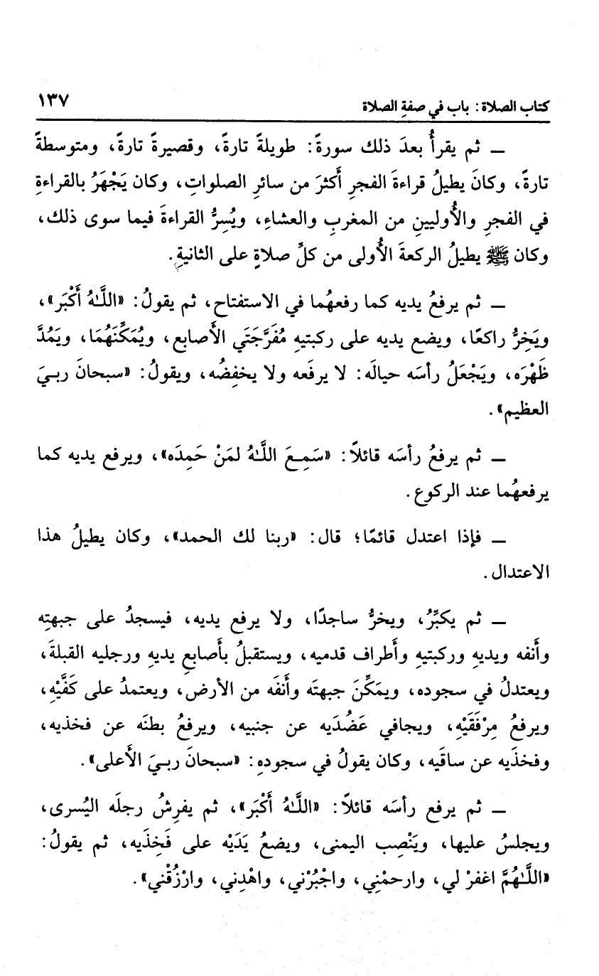 ثم يقرأ بعد ذلك سورة طويلة تارة وقصيرة تارة ومتوسطة تارة، وكان يطيل قراءة الفجر أكثر من سائر الصلوات، وكان يجهر بالقراءة في الفجر والأوليين من المغرب والعشاء ويسر القراءة فيما سوى ذلك، وكان يطيل الركعة الأولى من كل صلاة على الثانية.