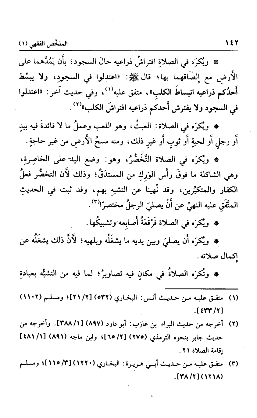 ويكره في الصلاة افتراش ذراعيه حال السجود؛ بأن يمدهما على الأرض مع إلصاقهما بها، قال: "اعتدلوا في السجود، ولا يبسط أحدكم ذراعيه انبساط الكلب"، متفق عليه، وفي حديث آخر: "ولا يفترش ذراعيه افتراش الكلب".