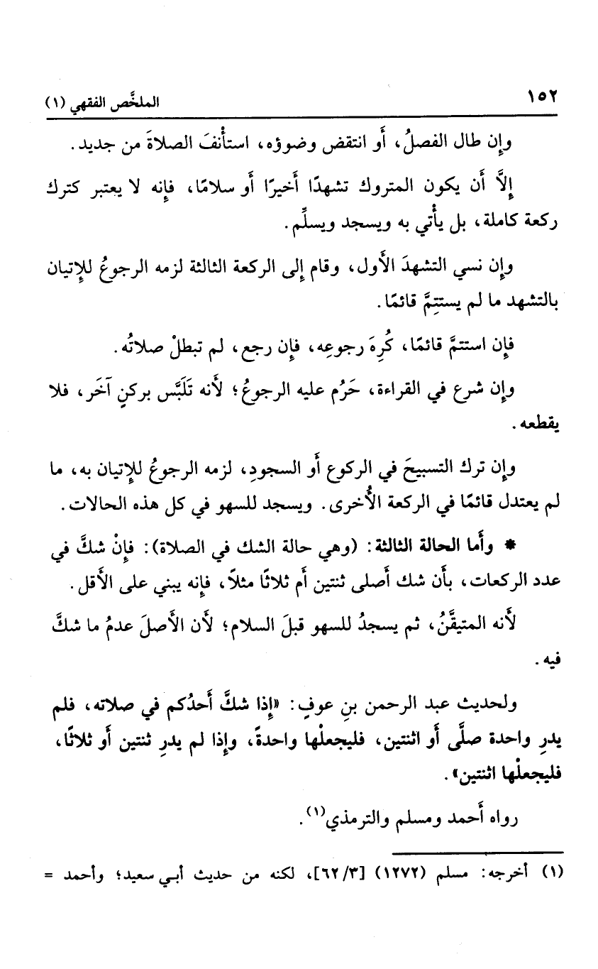 وإن طال الفصل، أو انتقض وضوؤه؛ استأنف الصلاة من جديد؛ إلا أن يكون المتروك تشهدًا أخيرًا أو سلاما؛ فإنه لا يعتبر كترك ركعة كاملة، بل يأتي به ويسجد ويسلم.
