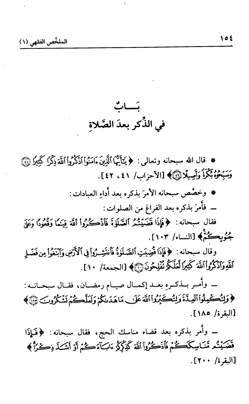 فأمر بذكره بعد الفراغ من الصلوات؛ فقال سبحانه: {فَإِذَا قَضَيْتُمُ الصَّلاةَ فَاذْكُرُوا اللَّهَ قِيَاماً وَقُعُوداً وَعَلَى جُنُوبِكُمْ} ، وقال سبحانه: {فَإِذَا قُضِيَتِ الصَّلاةُ فَانْتَشِرُوا فِي الْأَرْضِ وَابْتَغُوا مِنْ فَضْلِ اللَّهِ وَاذْكُرُوا اللَّهَ كَثِيراً لَعَلَّكُمْ تُفْلِحُونَ} .