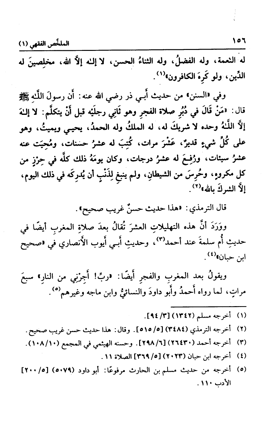 وفي "السنن " من حديث أبي ذر: أن رسول الله قال: "من قال في دبر صلاة الفجر وهو ثان رجليه قبل أن يتكلم: لا إله إلا الله وحده لا شريك له، له الملك، وله الحمد، يحي ويمت، وهو على كل شيء قدير؛ عشر مرات؛ كتب له عشر حسنات، ومحي عنه عشر سيئات، ورفع له عشر درجات، وكان يومه ذلك كله في حرز من كل مكروه، وحرس من الشيطان، ولم ينبغ لذنب أن يدركه في ذلك اليوم؛ إلا الشرك بالله"، قال الترمذي: "هذا حديث حسن صحيح "، وورد أن هذه التهليلات العشر تقال بعد صلاة المغرب أيضا في حديث أم سلمة عند أحمد، وحديث أبي أيوب الأنصاري في "صحيح ابن حبان ".