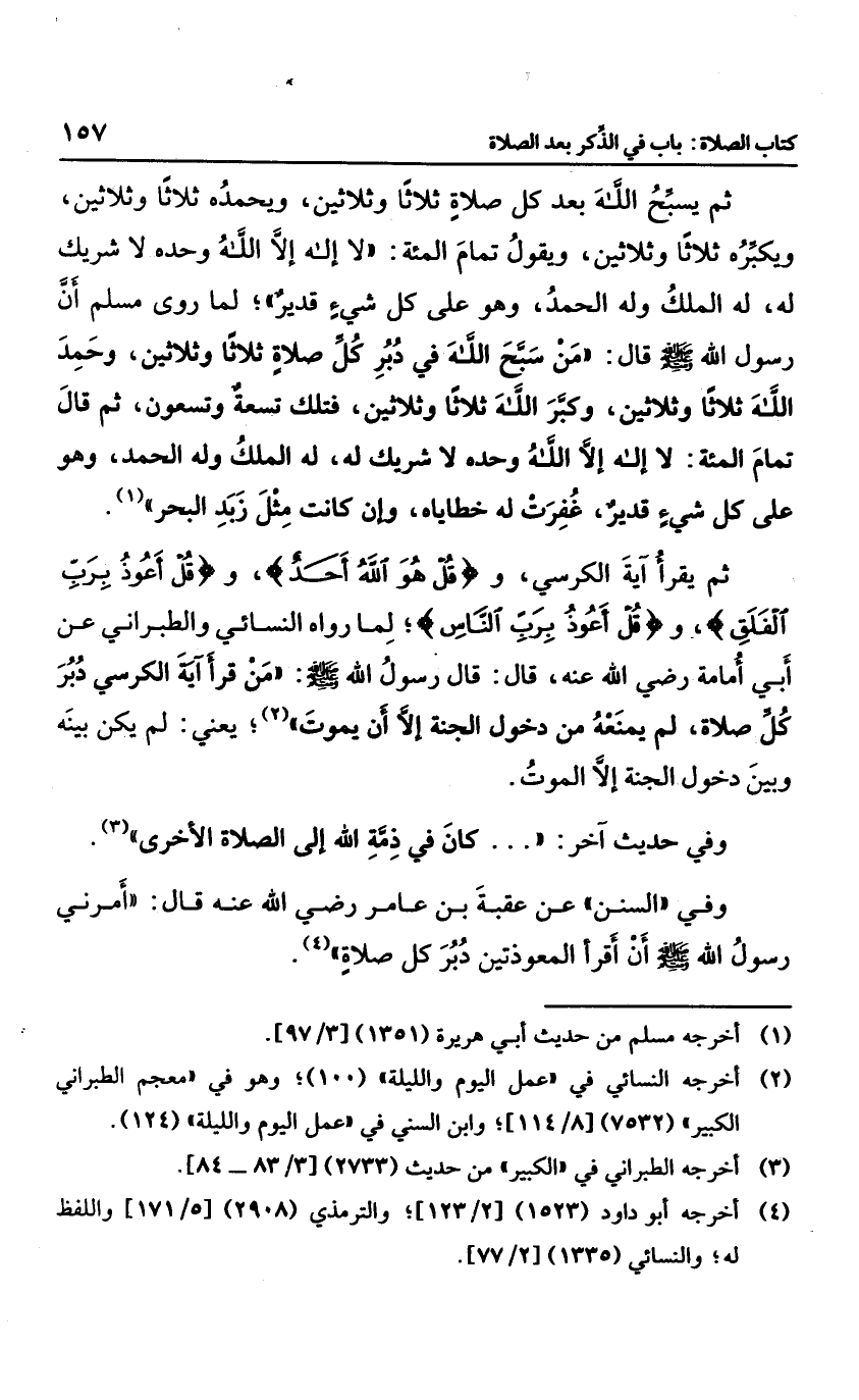 ثم يسبح الله بعد كل صلاة ثلاثا وثلاثين، ويحمده ثلاثا وثلاثين، ويكبره ثلاثا وثلاثين، ويقول تمام المئة: "لا إله إلا الله، وحده لا شريك له، له الملك وله الحمد، وهو على كل شيء قدير"؛ لما روى مسلم أن رسول الله قال: "من سبح الله في دبر كل صلاة ثلاثا وثلاثين، وحمد الله ثلاثا وثلاثين، وكبر الله ثلاثا وثلاثين؛ فتلك تسعة وتسعون، ثم قال تمام المئة: لا إله إلا الله وحده، لا شريك له، له الملك، وله الحمد، وهو على كل شيء قدير؛ غفرت له خطاياه، وإن كانت مثل زبد البحر".