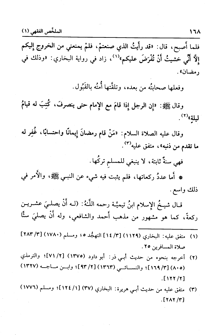 فلما أصبح؛ قال: "قد رأيت الذي صنعتم، فلم يمنعني من الخروج إليكم إلا أني خشيت أن تفرض عليكم"، وذلك في رمضان، وفعلها صحابته من بعده، وتلقتها أمته بالقبول، وقال: "من قام مع الإمام حتى ينصرف، كتب له قيام ليلة"، وقال: "من قام رمضان إيمانا واحتسابا؛ غفر له من ما تقدم من ذنبه"، متفق عليه.