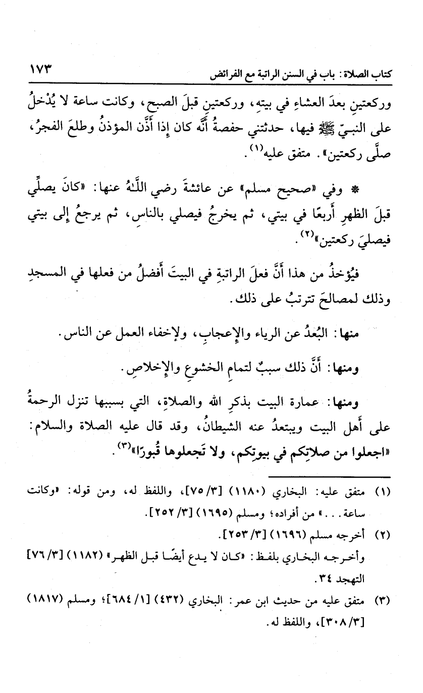 فيؤخذ من هذا أن فعل الراتبة في البيت أفضل من فعلها في المسجد، وذلك لمصالح تترتب على ذلك؛ منها: البعد عن الرياء والإعجاب ولإخفاء العمل عن الناس، ومنها: أن ذلك سبب لتمام الخشوع والإخلاص، ومنها: عمارة البيت بذكر الله والصلاة التي بسببها تنزل الرحمة على أهل البيت ويبتعد عن الشيطان، وقد قال: "اجعلوا من صلاتكم في بيوتكم، ولا تجعلوها قبوراً".