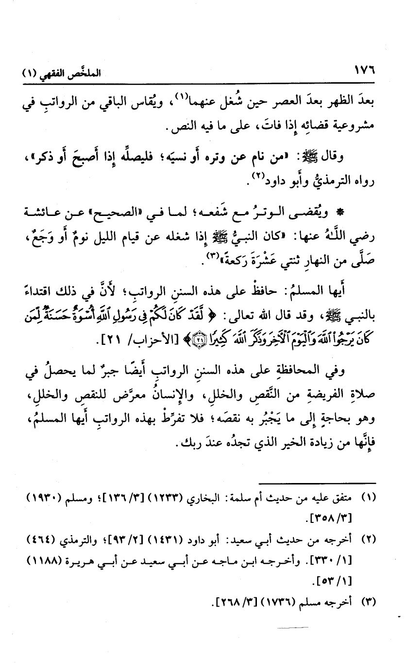 أيها المسلم، حافظ على هذه السنن الرواتب؛ لأن في ذلك اقتداء بالنبي، وقد قال الله تعالى: {لَقَدْ كَانَ لَكُمْ فِي رَسُولِ اللَّهِ أُسْوَةٌ حَسَنَةٌ لِمَنْ كَانَ يَرْجُو اللَّهَ وَالْيَوْمَ الْآخِرَ وَذَكَرَ اللَّهَ كَثِيراً} .